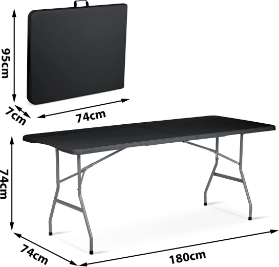 Det praktiske og robuste sammenklappelige bord på 180 cm er ideelt til havefester, bryllupper, konfirmationer og firmaarrangementer. Det har en stærk stålramme med pulverlakering, en vandafvisende og let rengørlig bordplade i PE samt nem transport takket være det integrerede håndtag. Når det er klappet sammen, fylder det minimalt og er stabilt, let og klar til hurtig brug.