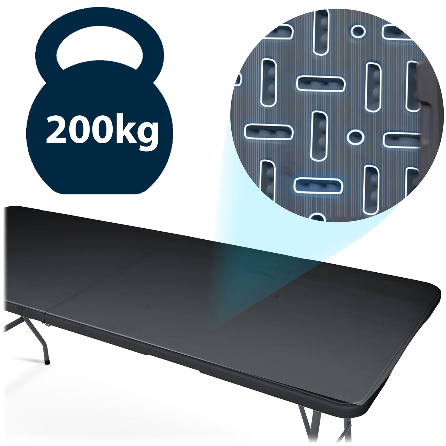Leder du efter et pålideligt bord til udendørs hygge, fester eller som mobil arbejdsflade? Dette sammenklappelige 180 cm bord kombinerer høj bæreevne op til 200 kg, modstandsdygtighed over for vand, UV og pletter samt hurtig sammenklapning til en kompakt kuffert med håndtag. Den robuste PE-plade og stålrammen med pulverlak sikrer lang levetid.