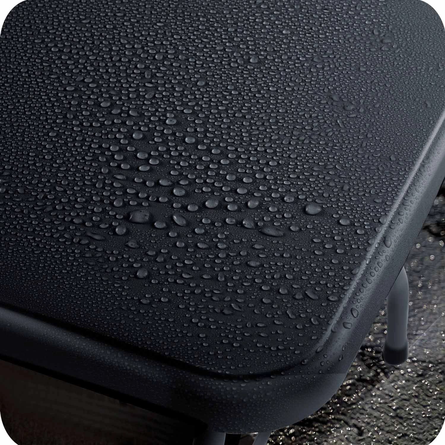 - Holdbarhed i fokus: PE-plade modstandsdygtig over for vand, UV og slid, stålben med pulverlak.