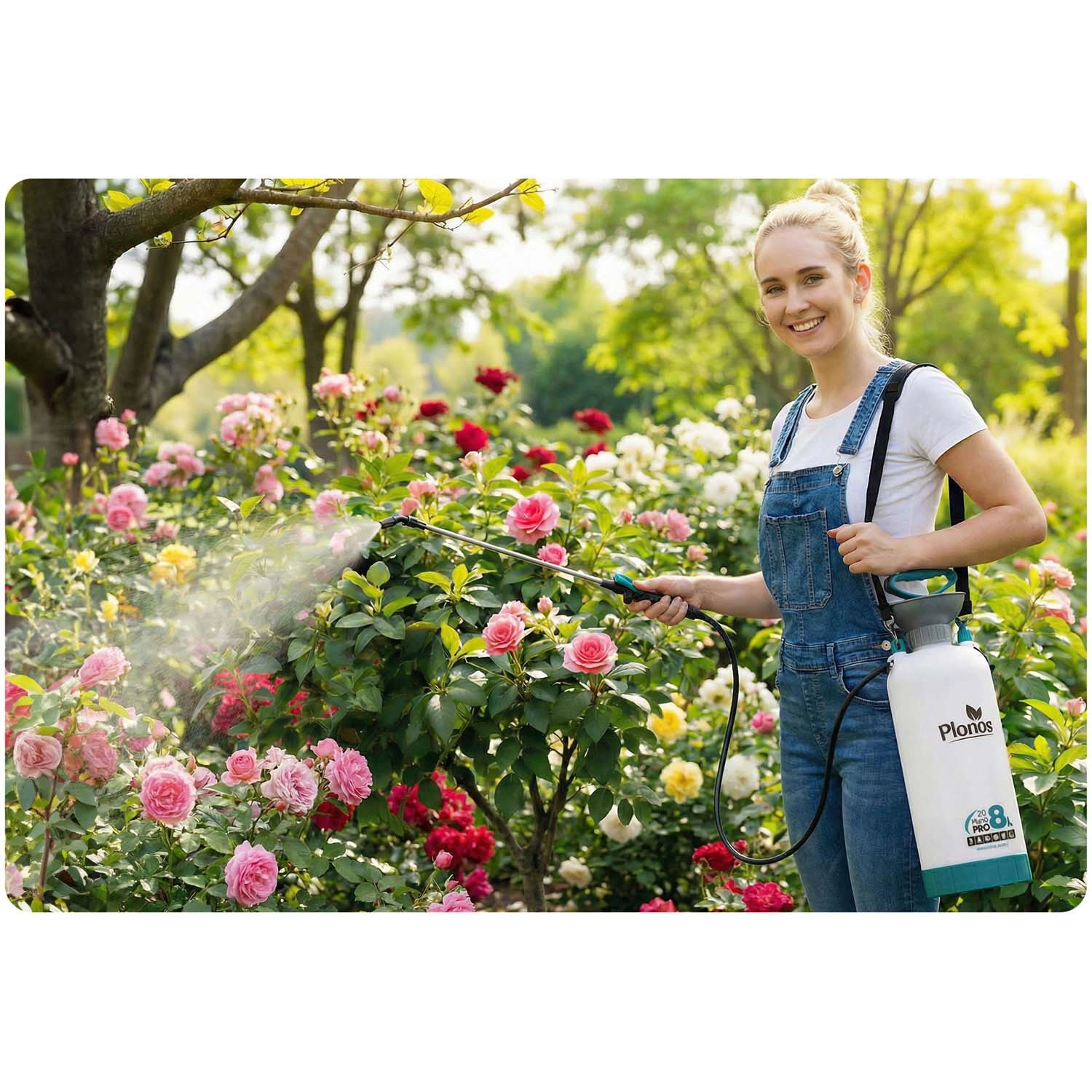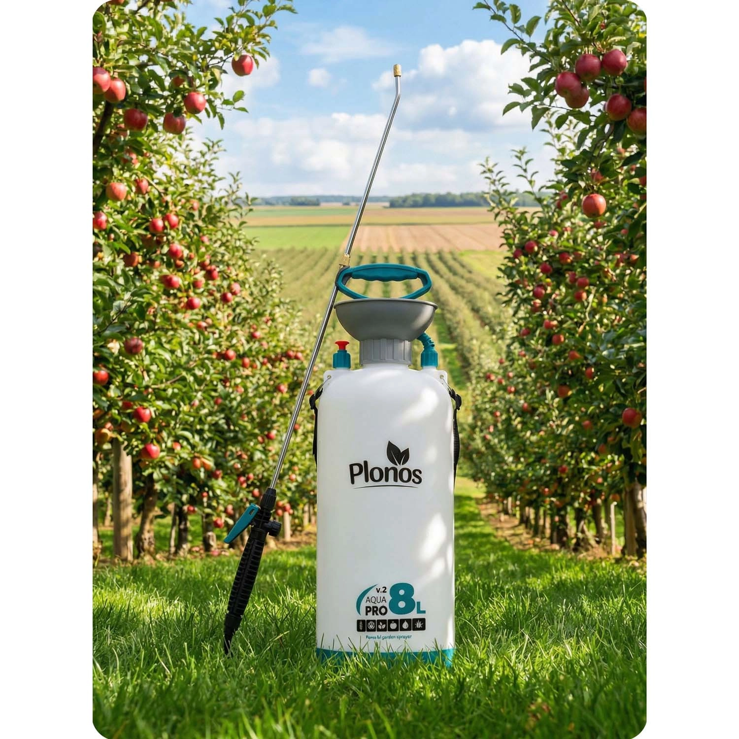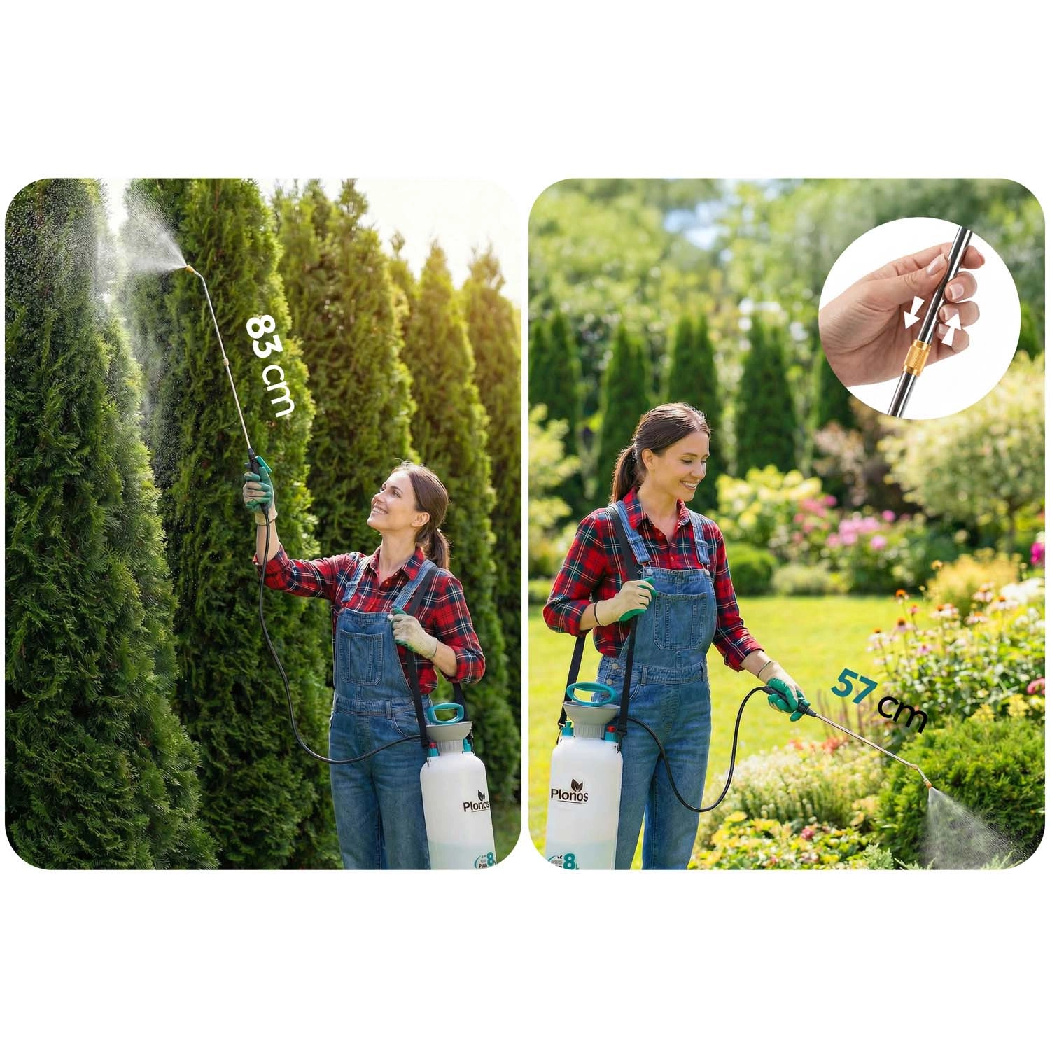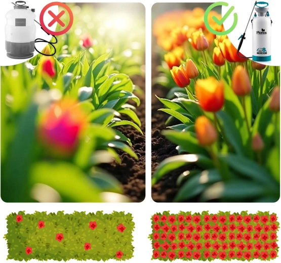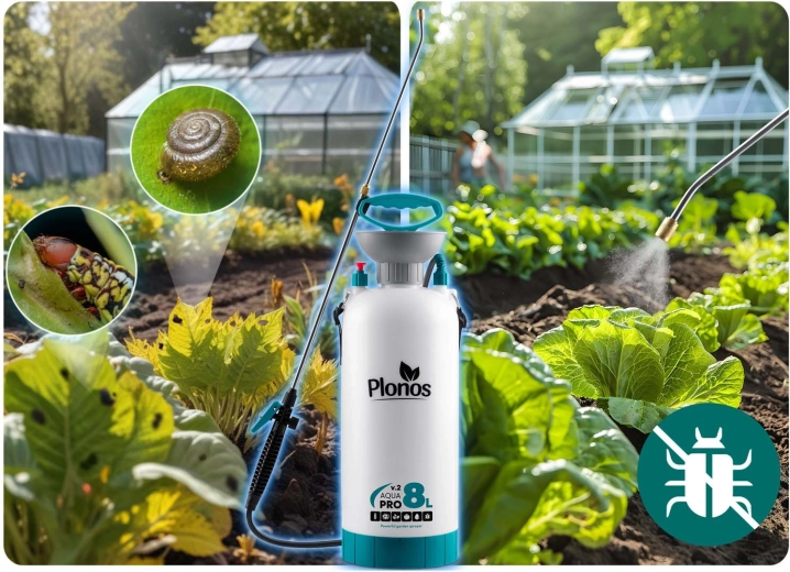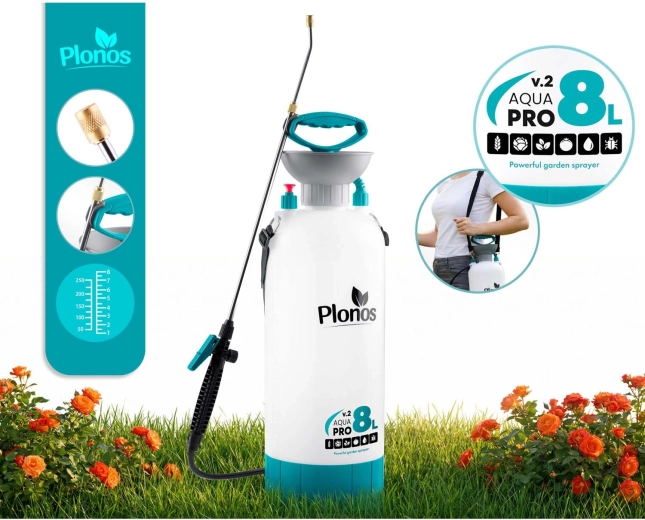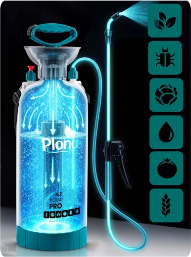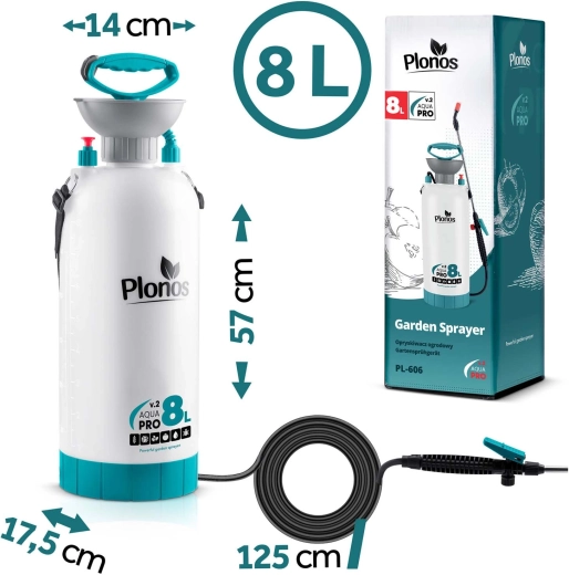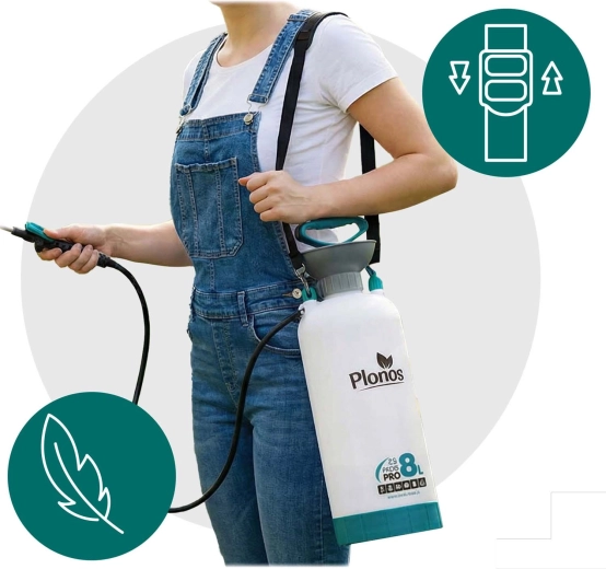 Sprøjten Plonos 8 l er en pålidelig hjælper til daglige haveopgaver. Takket være kvalitetsmaterialer – rustfrit stål, messing og holdbar PE – modstår den kemiske midler og langvarig brug. Kontrolleret tryk på 2,76 bar fordeler væsken jævnt og giver præcise resultater ved sprøjtning af blomster, grøntsager, buske og træer.
