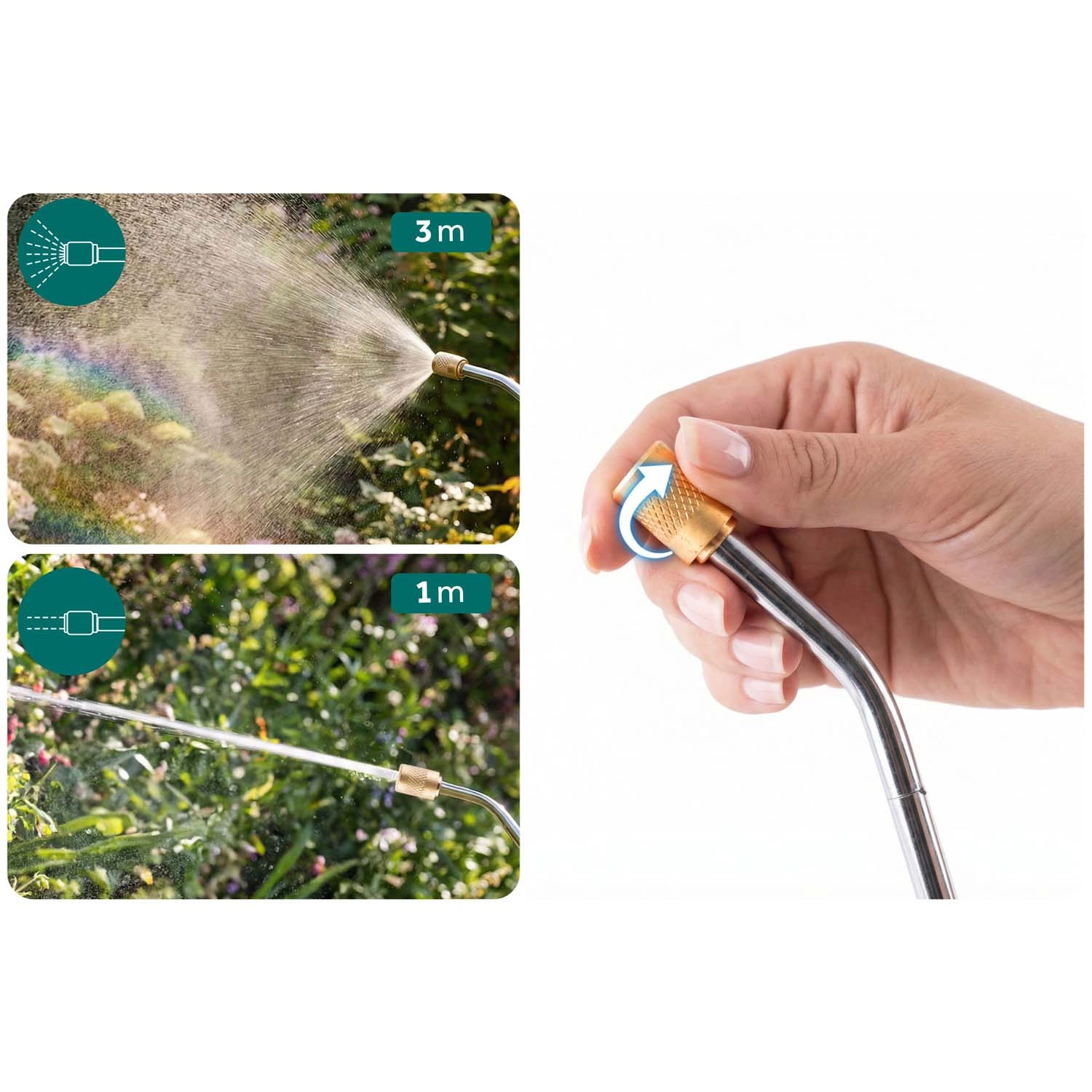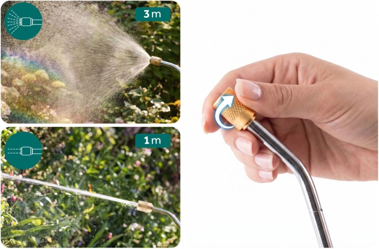 Fra fin tåge til kraftig stråle – trinløs indstilling gør det muligt at tilpasse flowet til opgaven. De holdbare metaller tåler kemikalier bedre og sikrer lang levetid uden tilstopning.