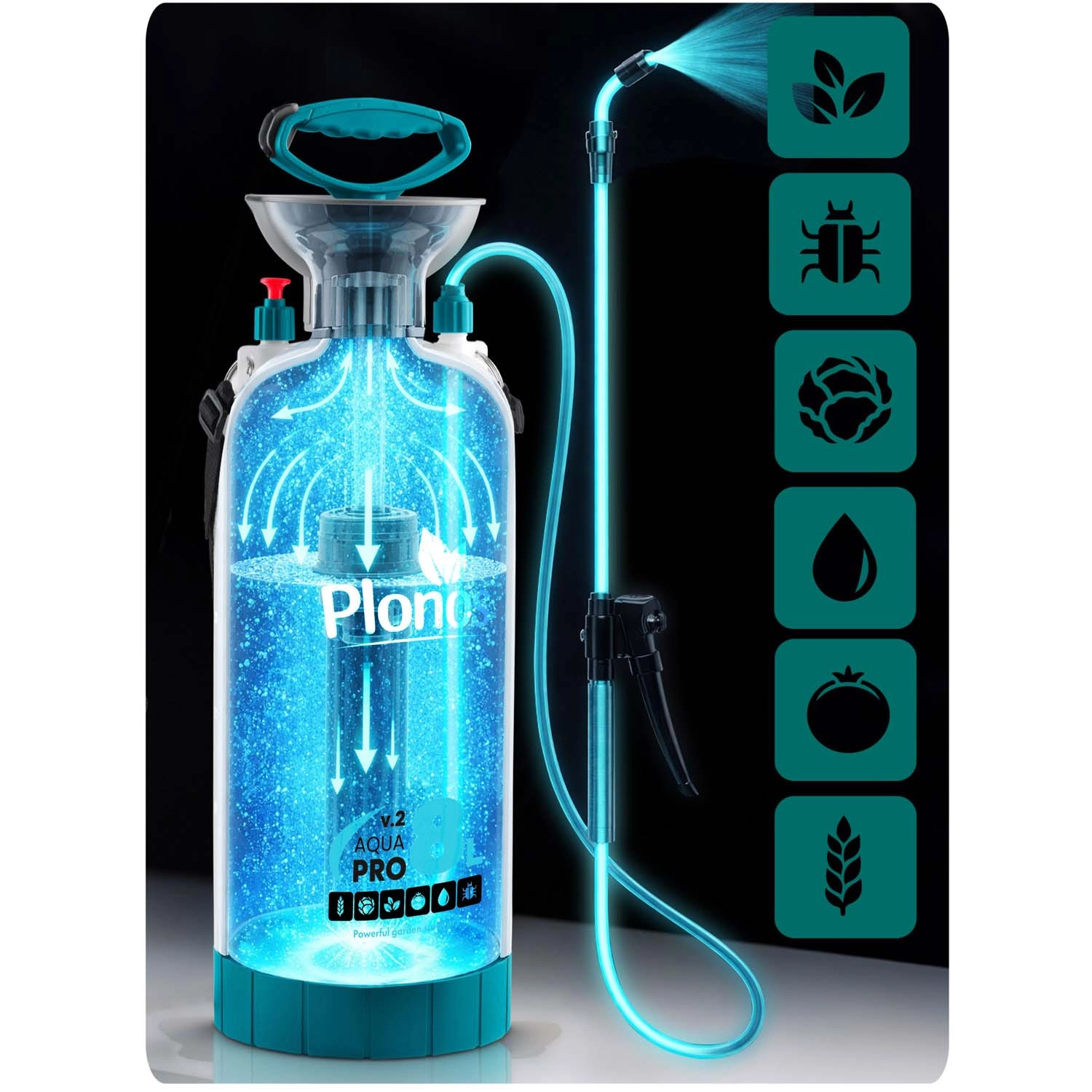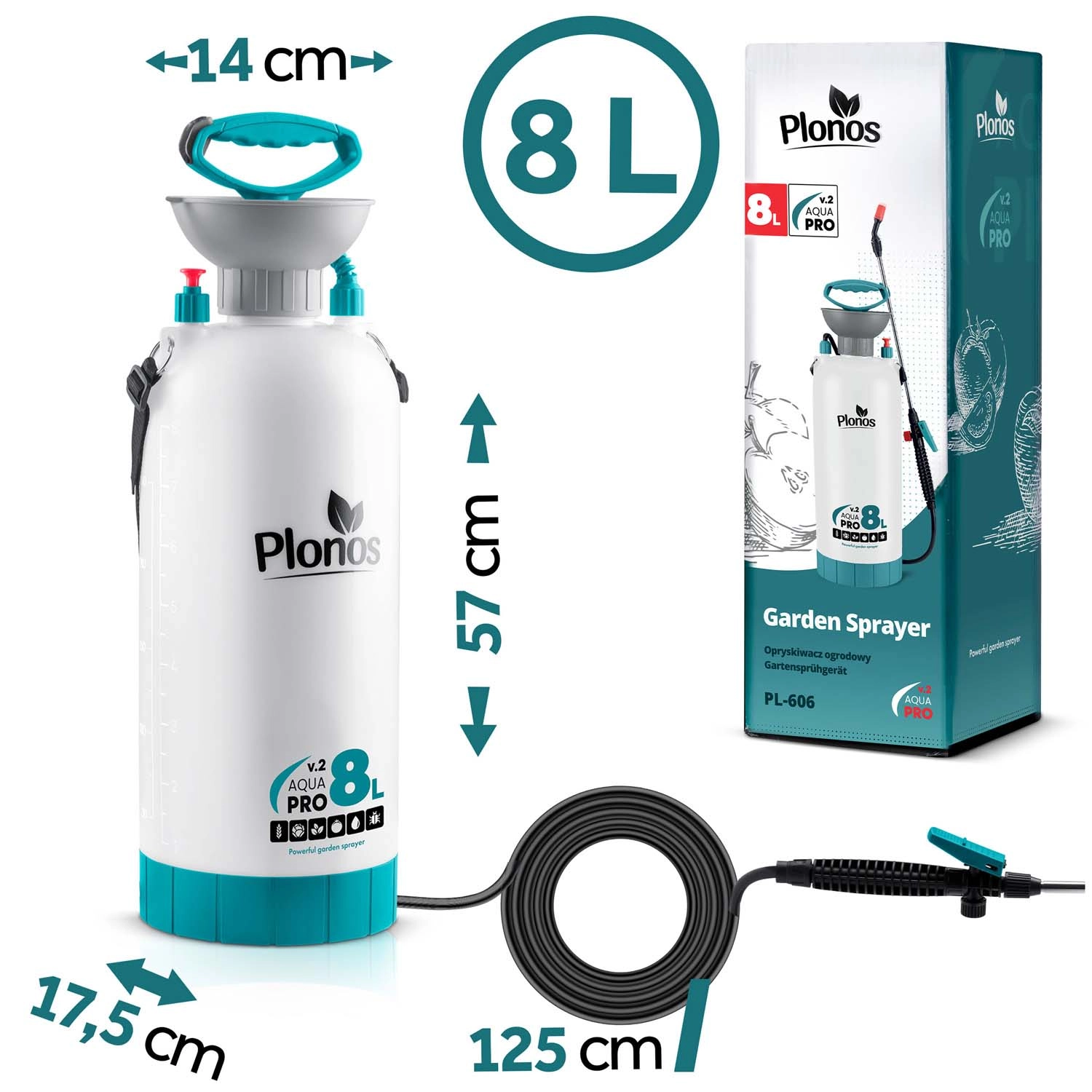 Den kraftige og holdbare håndsprøjte Plonos med en kapacitet på 8 l er ideel til havepleje – fra vanding og gødskning til beskyttelse mod skadedyr. Den tilbyder en integreret bred tragt for nem påfyldning, en rustfri lanse med messingdyse for præcis sprøjtning og en justerbar skulderrem for behagelig bæring. Den robuste PE-beholder tåler kemikalier og gødning, og det kontrollerede tryk på 2,76 bar sikrer både jævn tåge og kraftigere stråle.