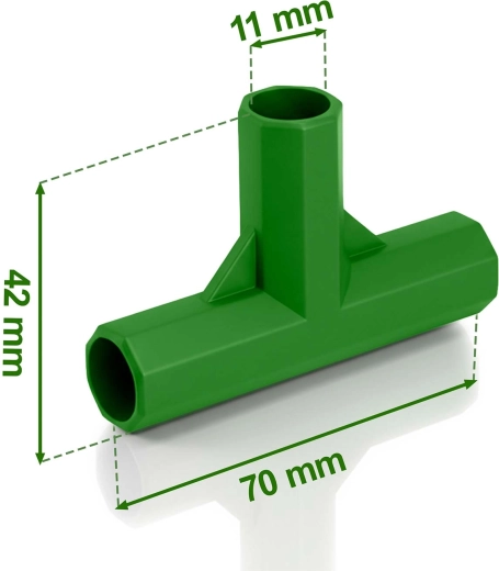 Praktiske T-samlere til havestænger med en diameter på 11 mm gør det nemt og hurtigt at bygge stabile konstruktioner til tomater og andre klatreplanter. Takket være det modulære system kan du let skabe stabile støtter, gitre, telte og tunneler præcis efter behov. Det holdbare PE-plast sikrer lang levetid, og samlingen holder solidt selv under belastning.