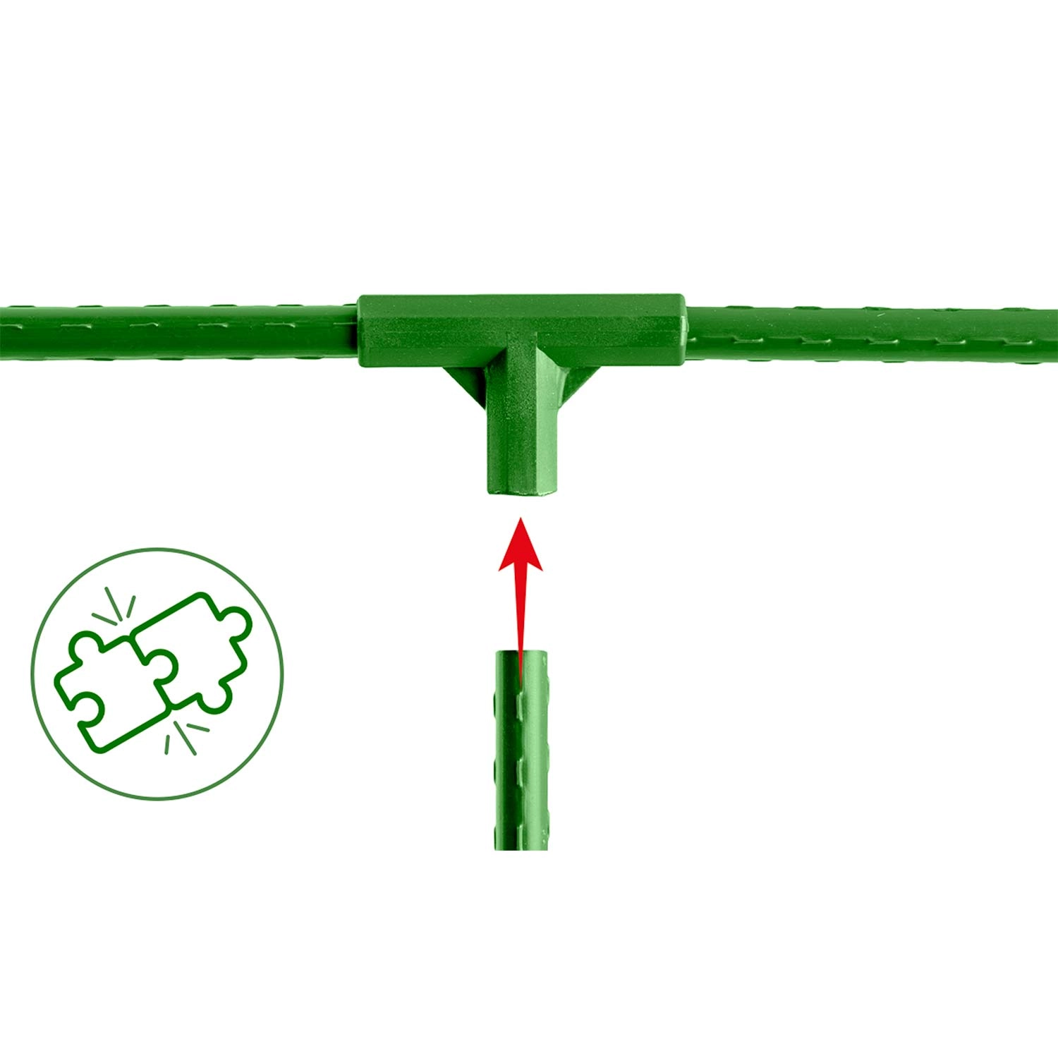 Det glatte, robuste plastlegeme på T-stykket danner en ret vinkel til tværstænger og gitre. Samlingen er tæt og stabil selv ved plantens belastning.
