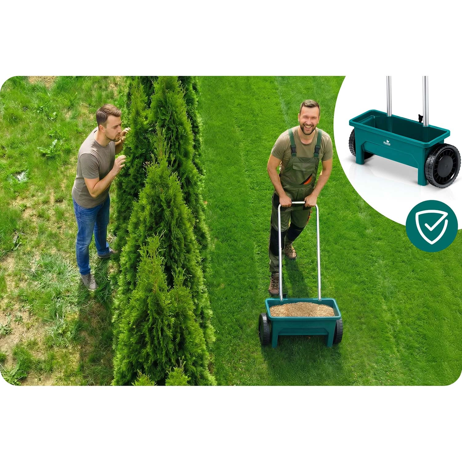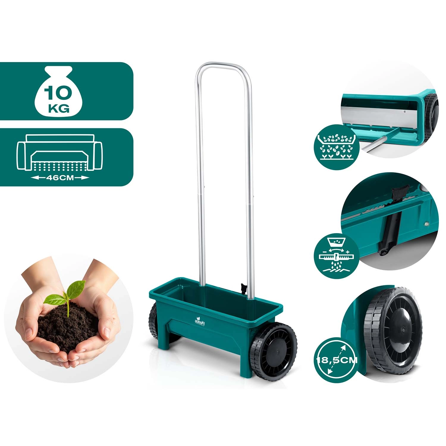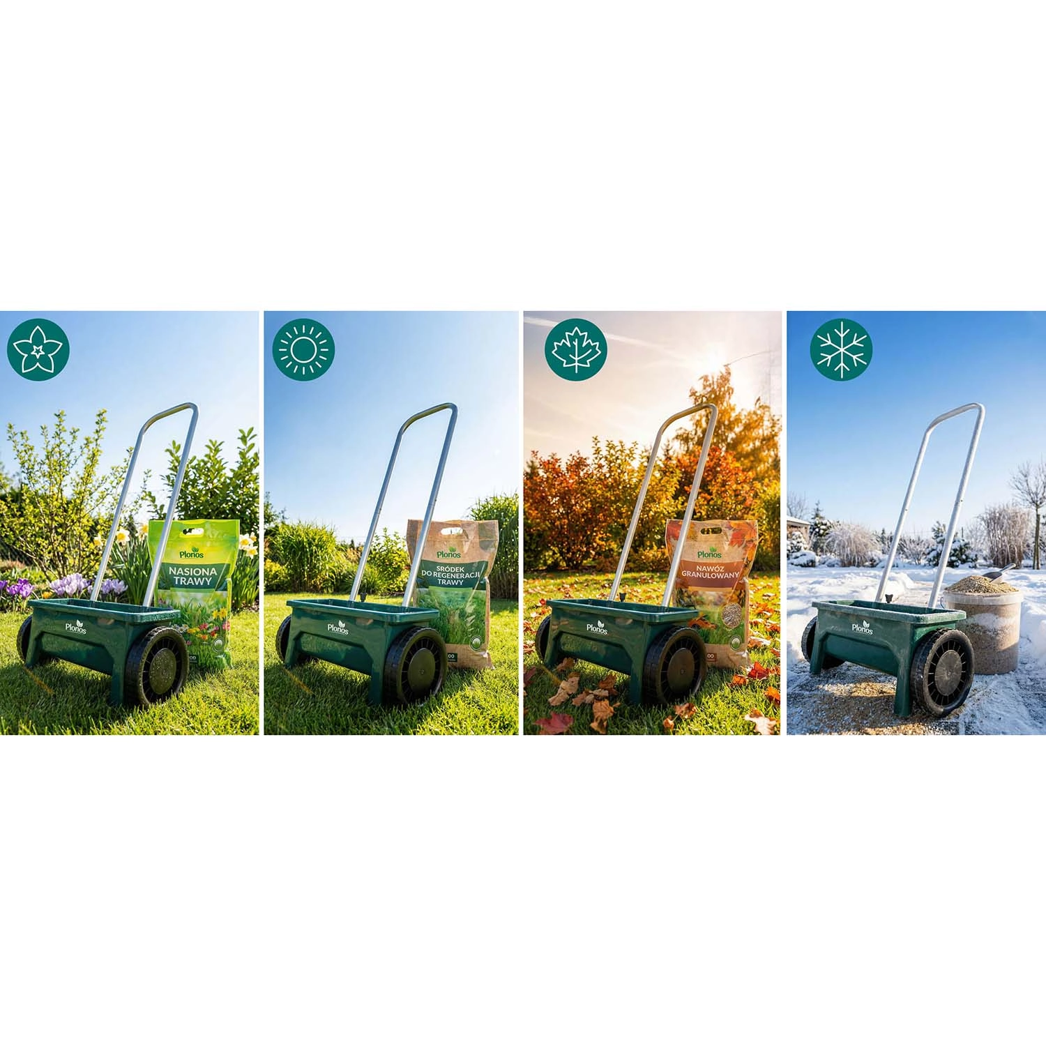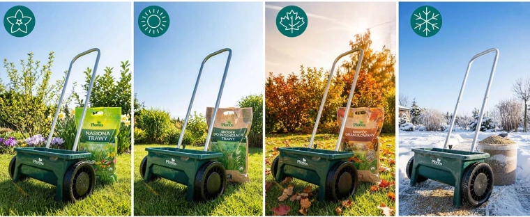 Såning og gødskning i sæsonen, om vinteren salt og sand på fortove og indkørsler. Ét værktøj til hele året.