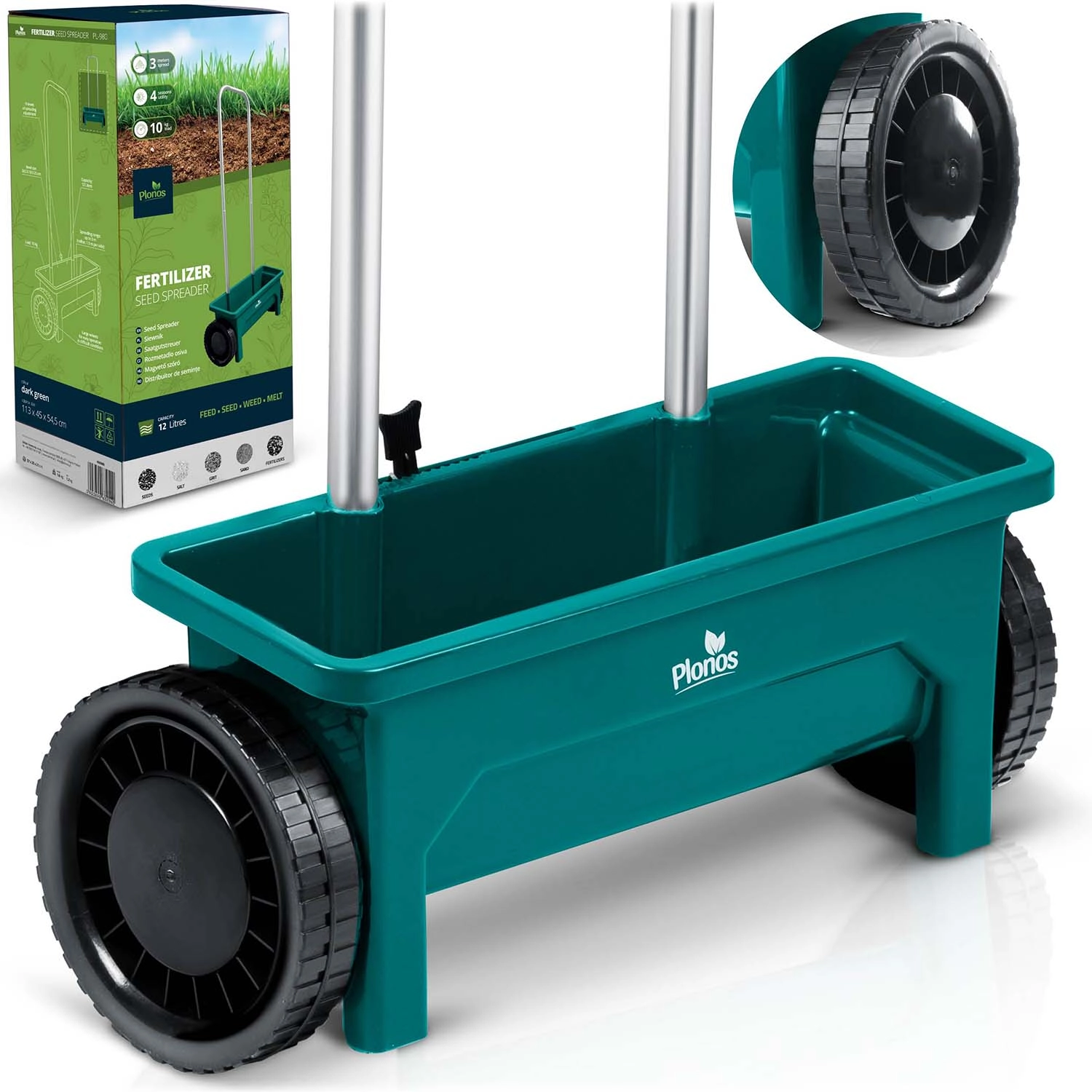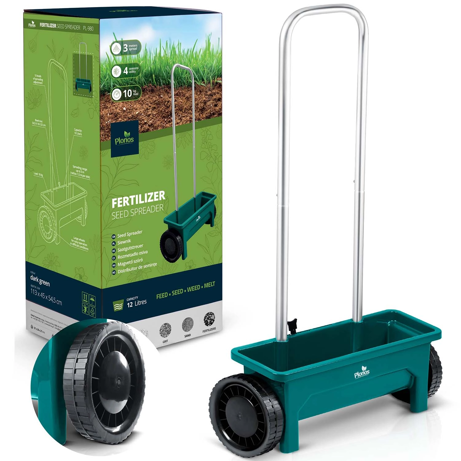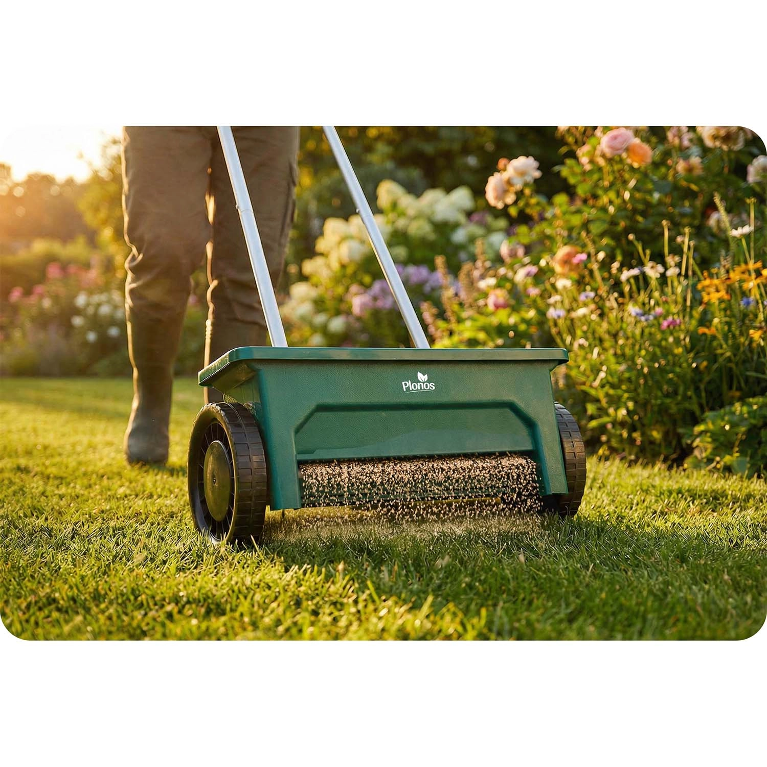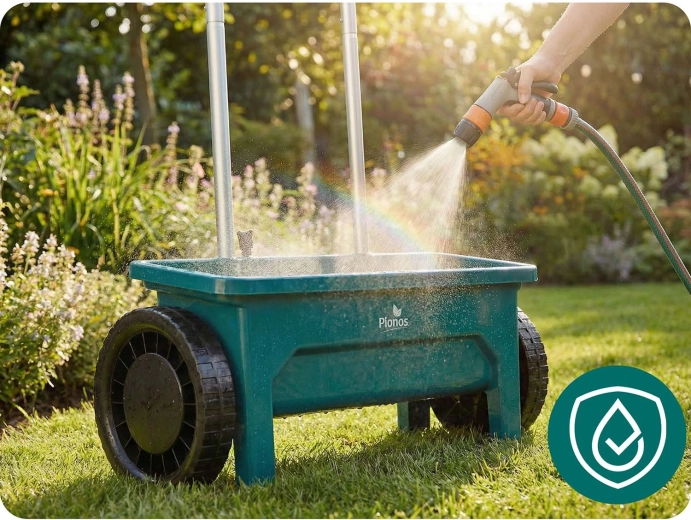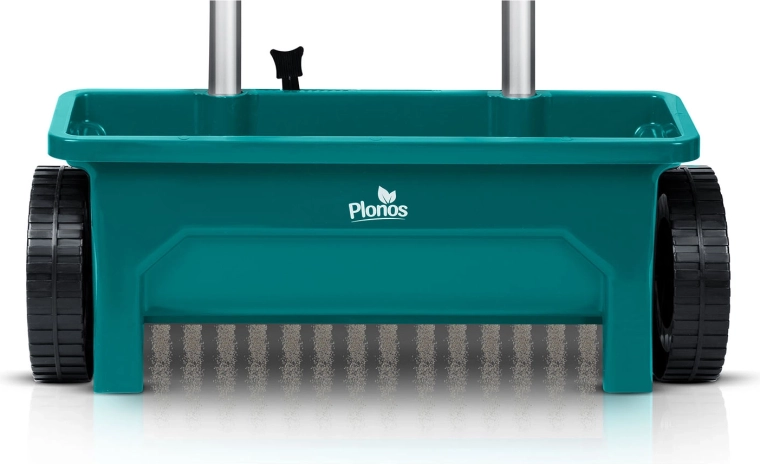 PLONOS 12 l sprederen er en pålidelig hjælper til pleje af græsplænen og vedligeholdelse af gangarealer. Fra forår til vinter doserer den nemt græsfrø, gødning, granulat, sand og vejsalt. Den justerbare gennemstrømning i 10 trin gør det muligt præcist at tilpasse mængden og kornstørrelsen på det spredte materiale for ensartet dækning af arealet.