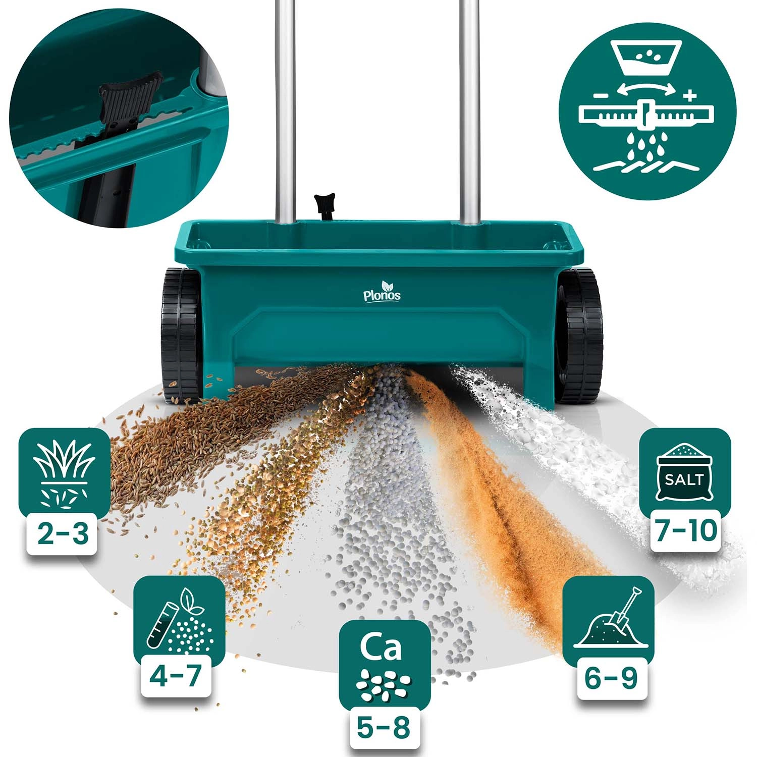 Finjuster flowet til forskellige materialer – fra fine græsfrø til grovere salt eller granulat. Jævn udspredning uden unødvendigt spild.