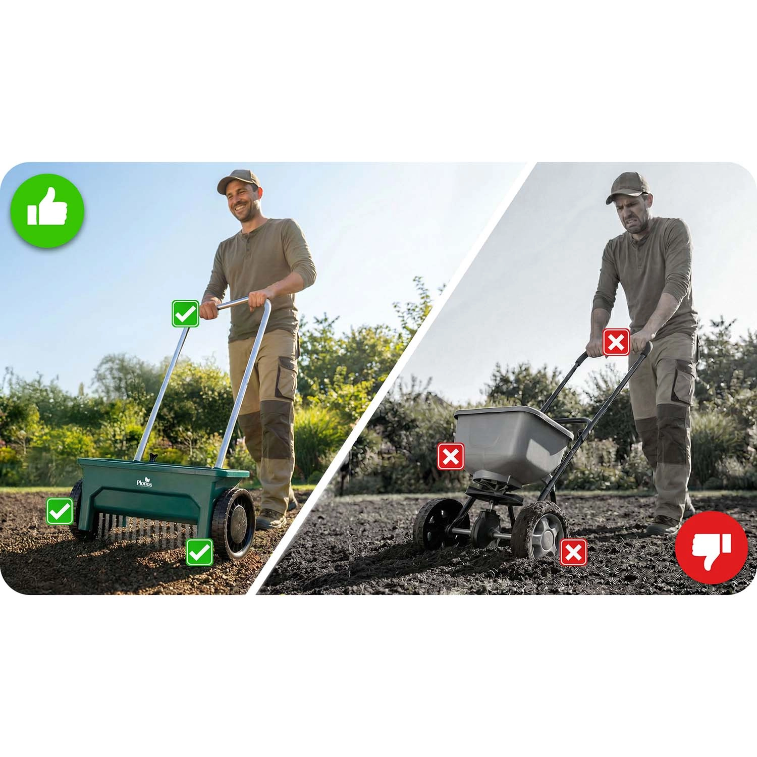 Stabil og let manøvrering på græsplæne og faste underlag. Sprederen holder retningen, og spredningsbilledet forbliver ensartet.