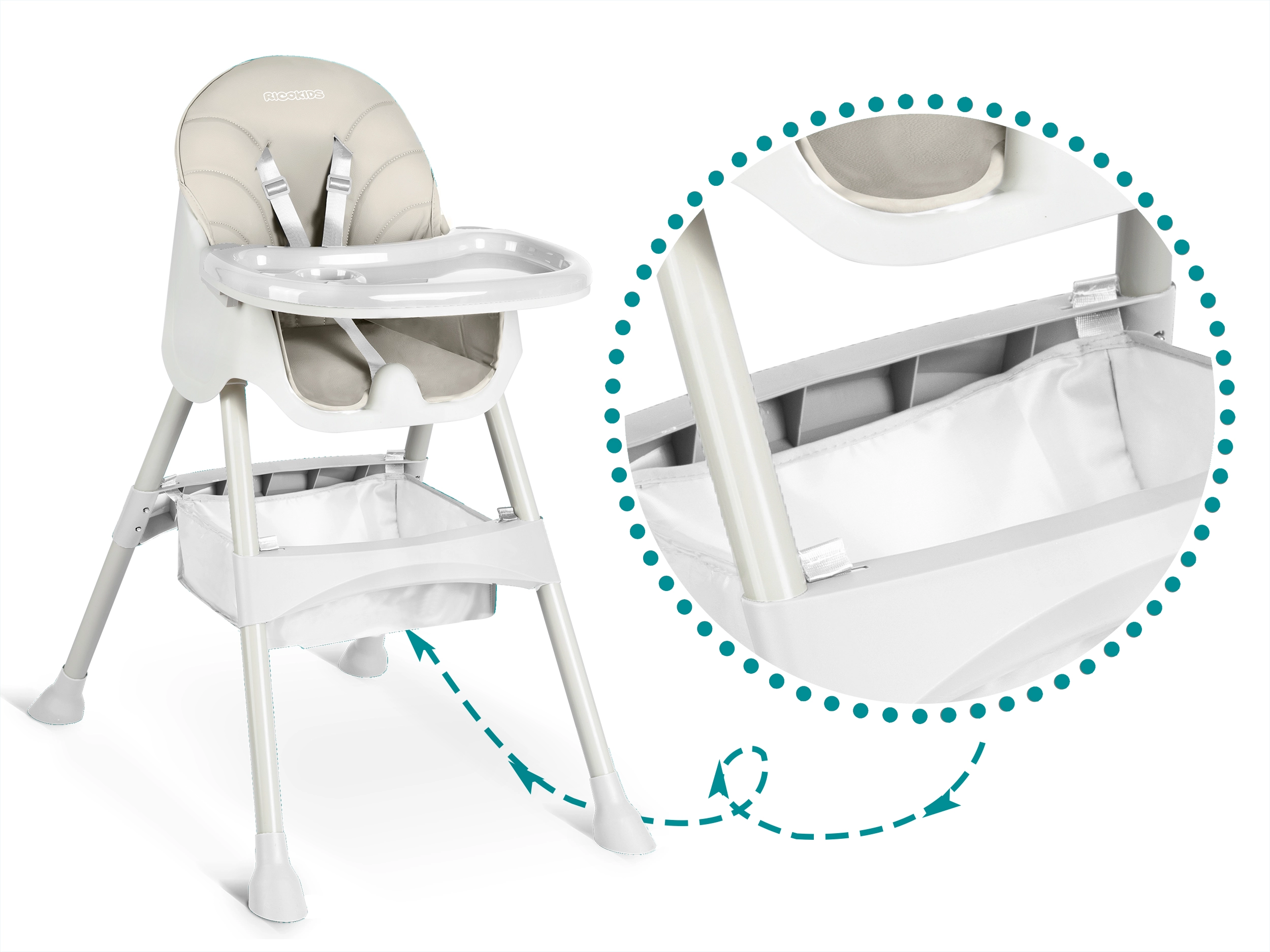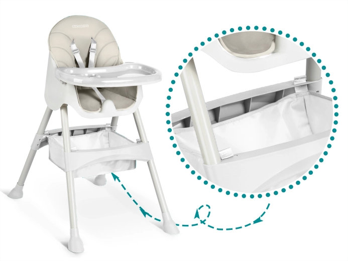 Sikkerheden sikres af pålidelige 5-punkts seler og brede skridsikre ben med gummifødder for stabilitet på forskellige underlag. Den praktiske foldning muliggør kompakt opbevaring, så stolen fylder minimalt. Med i pakken følger også en robust kurv under sædet, hvor du kan opbevare legetøj eller spiseredskaber.