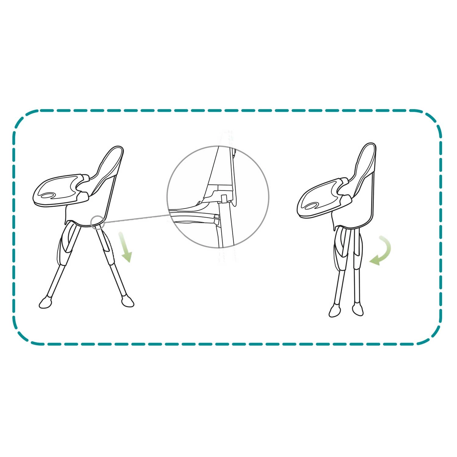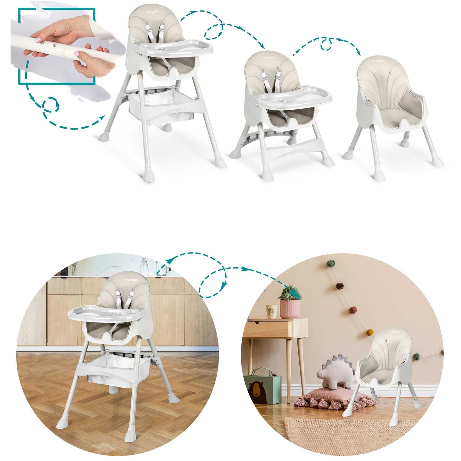 - Vokser med barnet (3-i-1): høj stol, booster/lav stol.