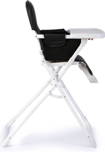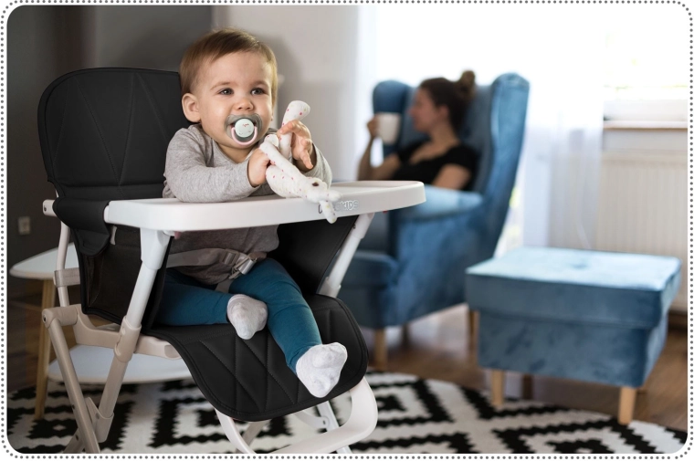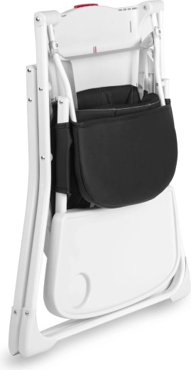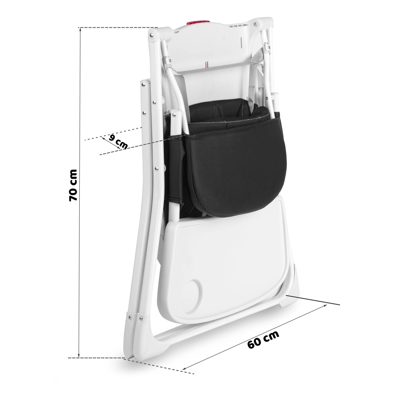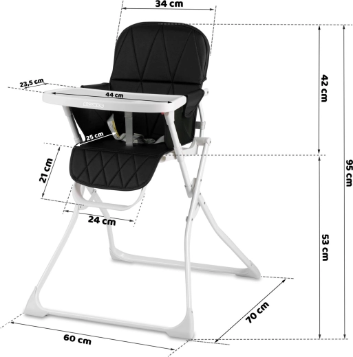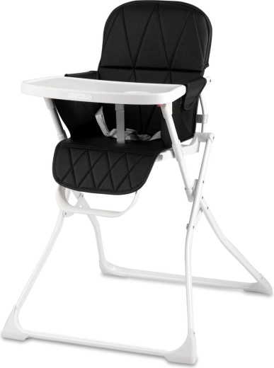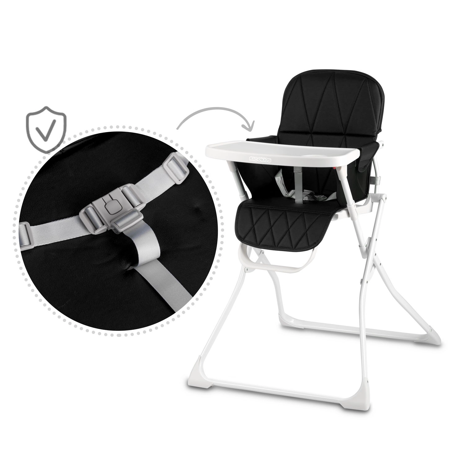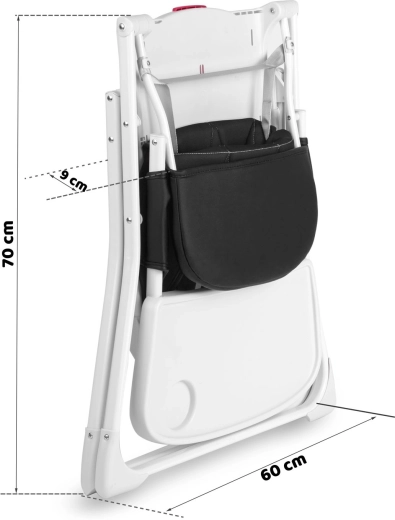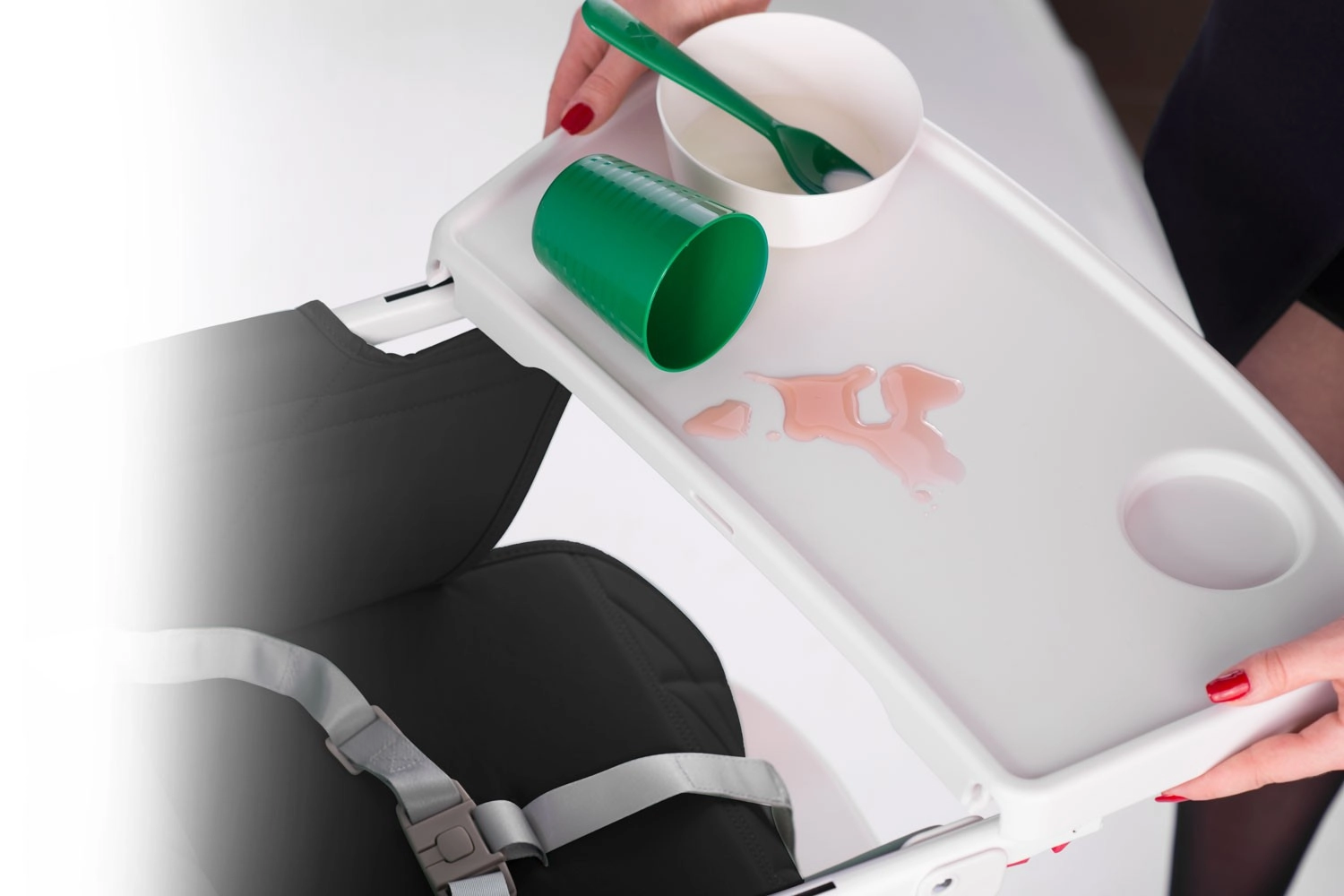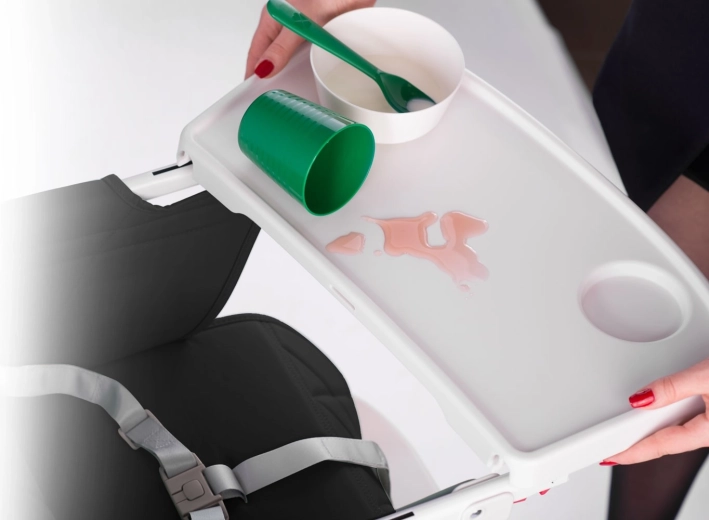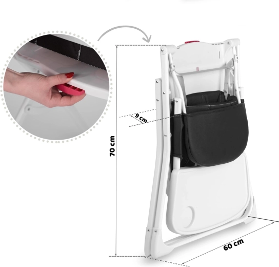 Takket være hurtig sammenklapning med ét tryk kan stolen på et øjeblik stilles væk i et skab eller et hjørne. 3-punkts seler med justerbar længde holder barnet i en stabil og sikker position, mens fodstøtten understøtter korrekt siddestilling og komfort under både måltider og leg.
