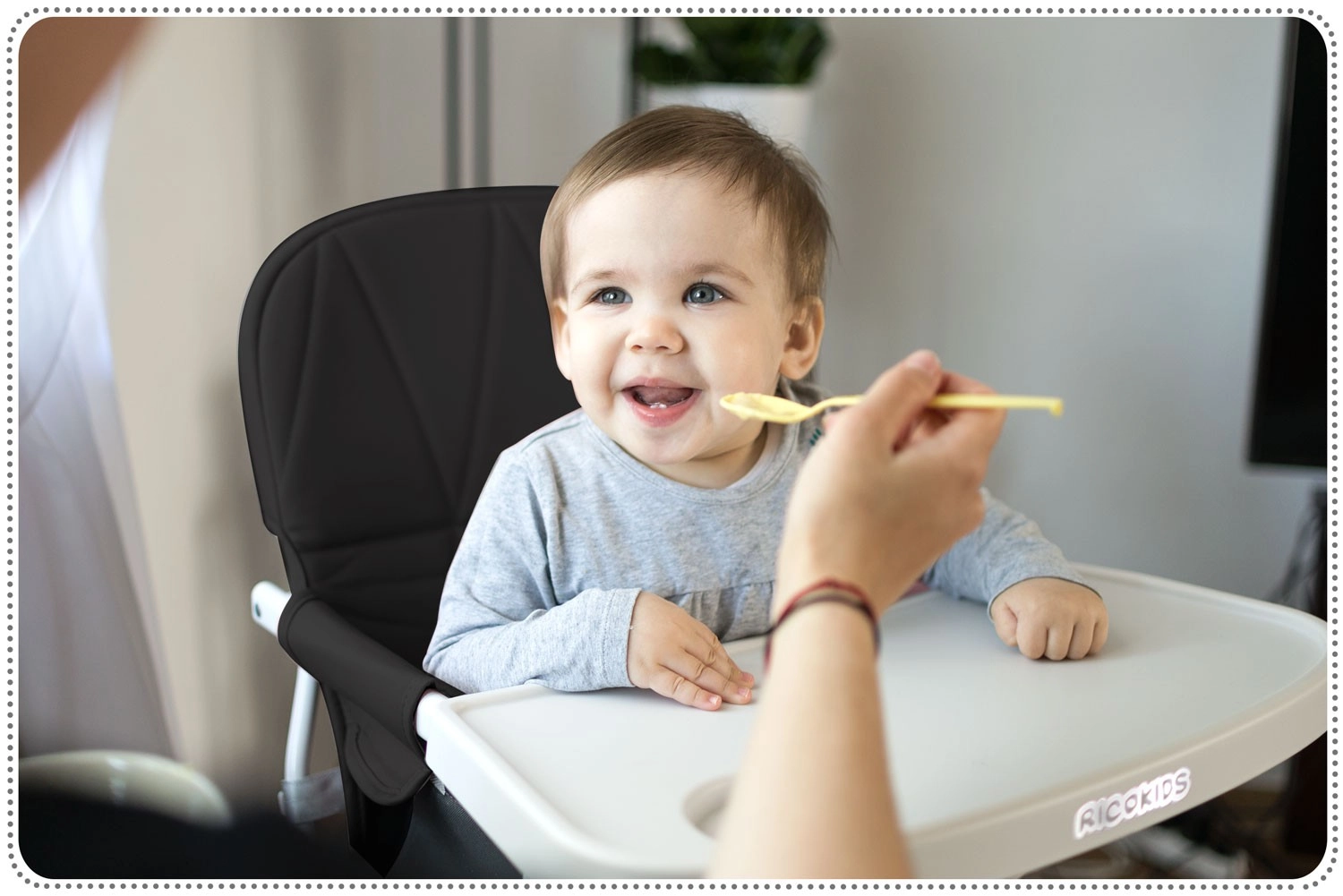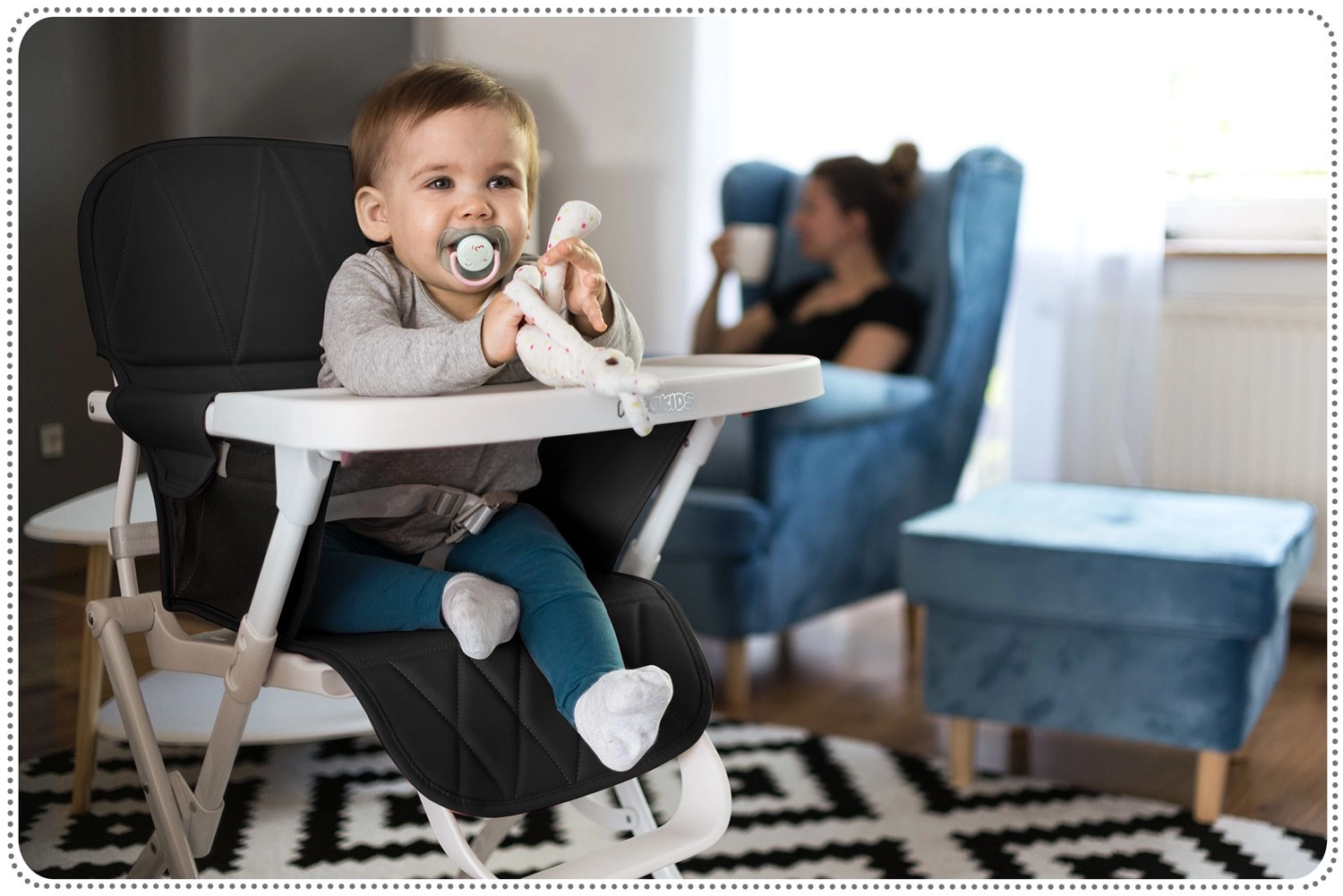 Høj stolen RICOKIDS Nuco kombinerer moderne, minimalistisk design og funktionalitet til hverdagens måltider. Bakken med forhøjede kanter og dedikeret plads til kop forhindrer spild, mens det polstrede, quiltede betræk sikrer maksimal komfort. Materialerne er nemme at vedligeholde – bakken kan tages af og skylles under rindende vand, og betrækket kan nemt aftørres.