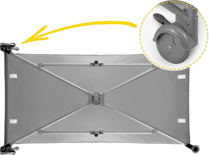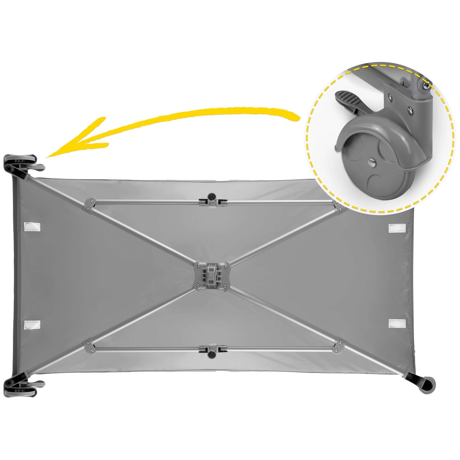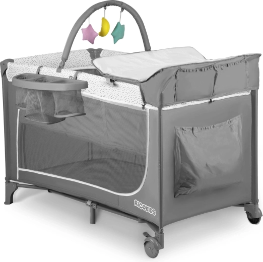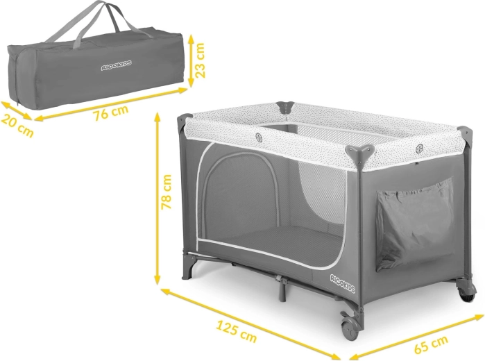 Pakken indeholder sammenklappelig madras, puslebord, legetøjsbøjle, praktisk organizer og lomme samt transporttaske. Hjul med bremse gør det nemt at flytte den rundt i hjemmet og sikrer stabil placering. Den robuste konstruktion uden skarpe kanter og lås mod utilsigtet sammenklapning øger sikkerheden. Sengen foldes hurtigt ud og sammen – ideel til rejser, besøg og daglig brug.