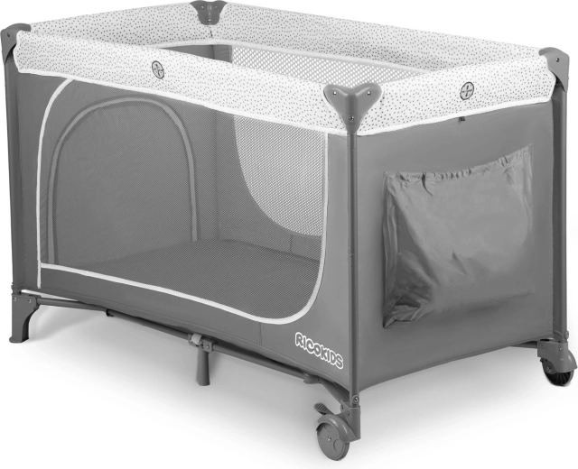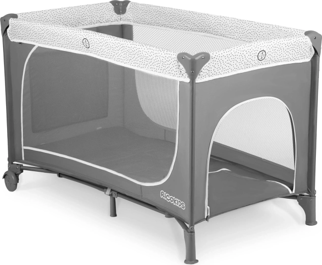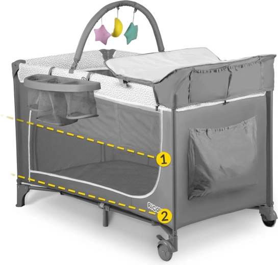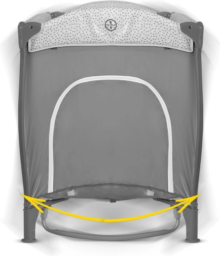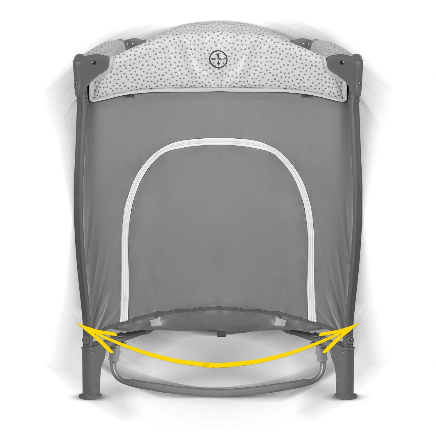 Rejsesengen i elegant grå er designet for maksimal komfort og sikkerhed for barnet samt bekvemmelighed for forældrene. Takket være to højdepositioner på bunden tilpasses den nemt barnets alder og behov. Sideindgang med lynlås hjælper større børn med selv at komme ind og ud, mens åndbare netpaneler giver fremragende luftcirkulation og overblik.