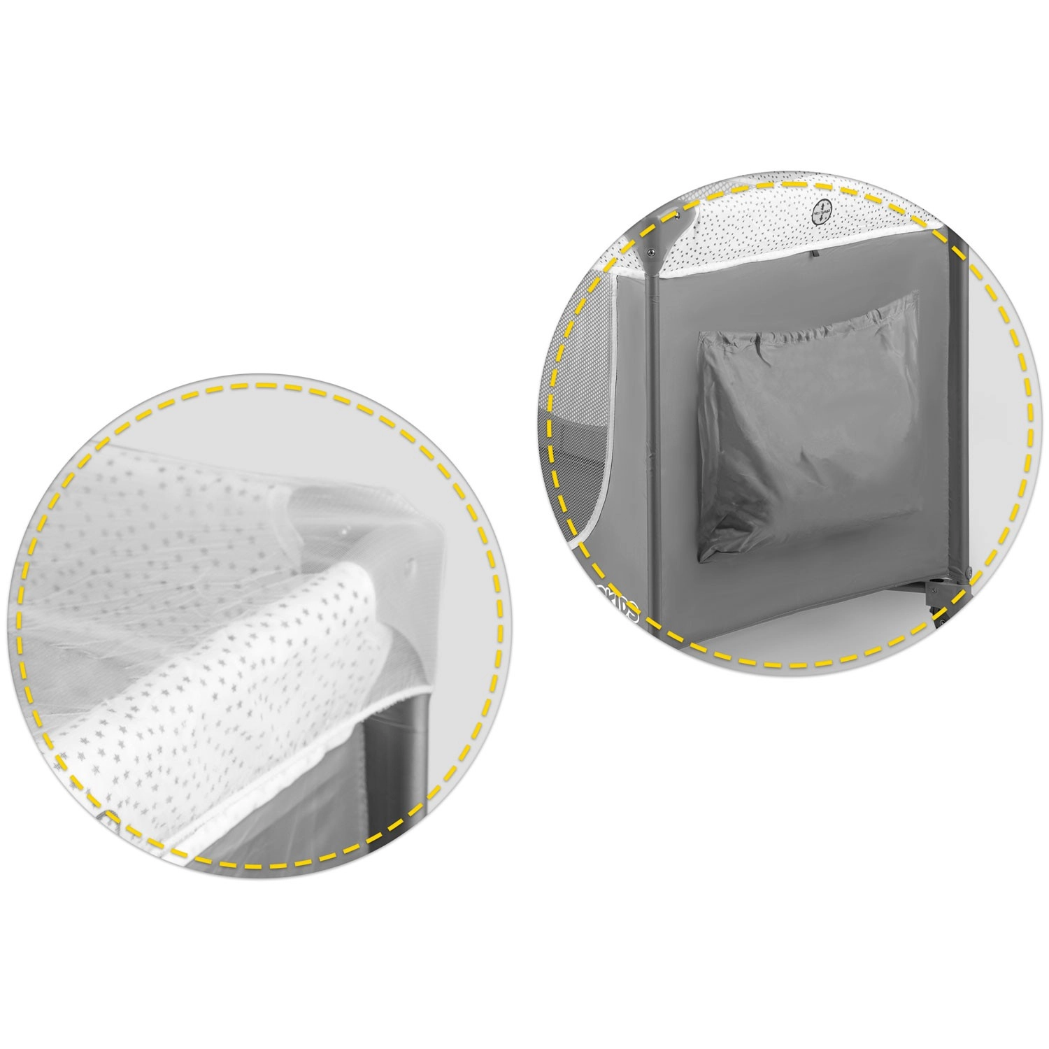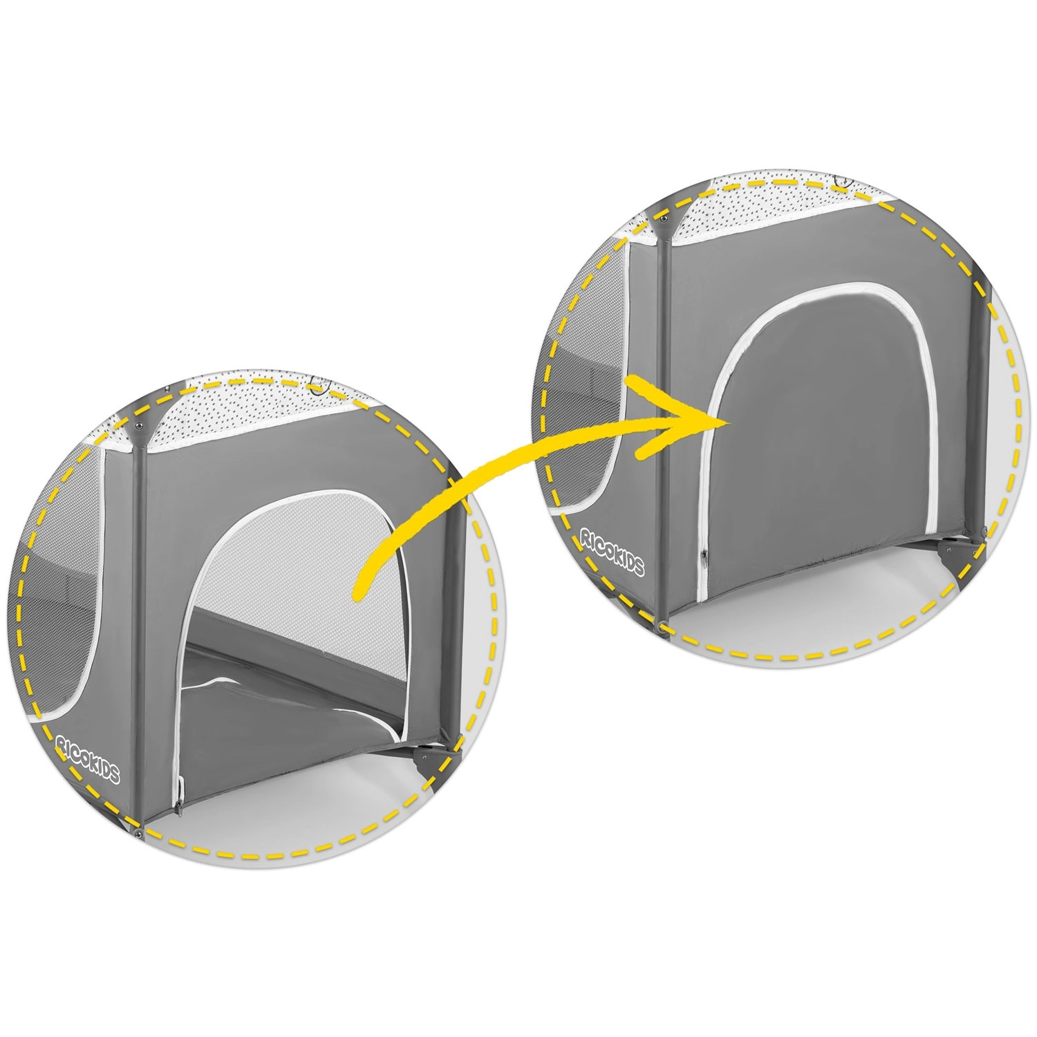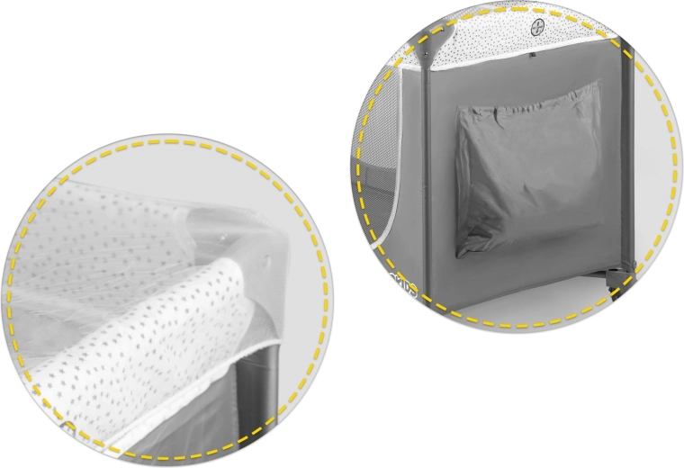 Den lynlåslukkede sideåbning gør det lettere for større børn selv at kravle ind og ud. Netvæggene sikrer luftcirkulation og konstant overblik.