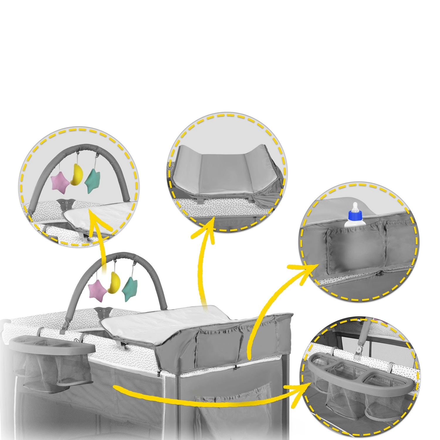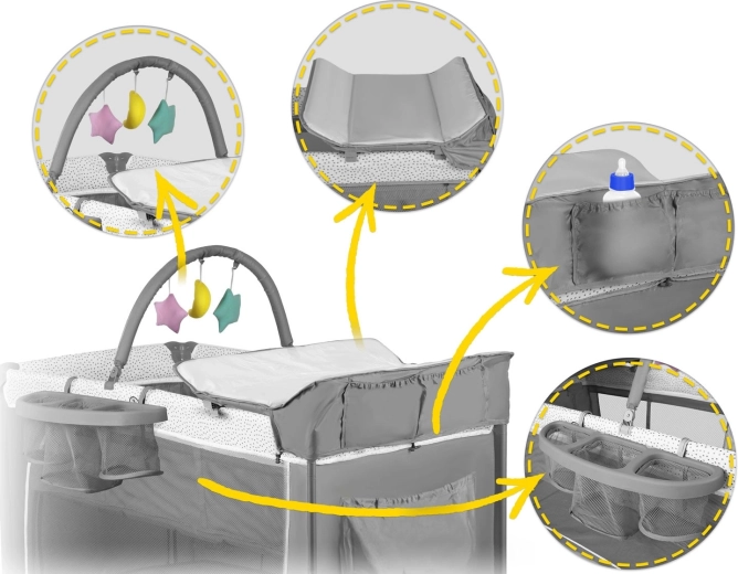Komplet udstyr: pusleenhed, legetøjsbøjle, sidelommer og organizer til bleer og flasker. Inklusive sammenklappelig madras og transporttaske.