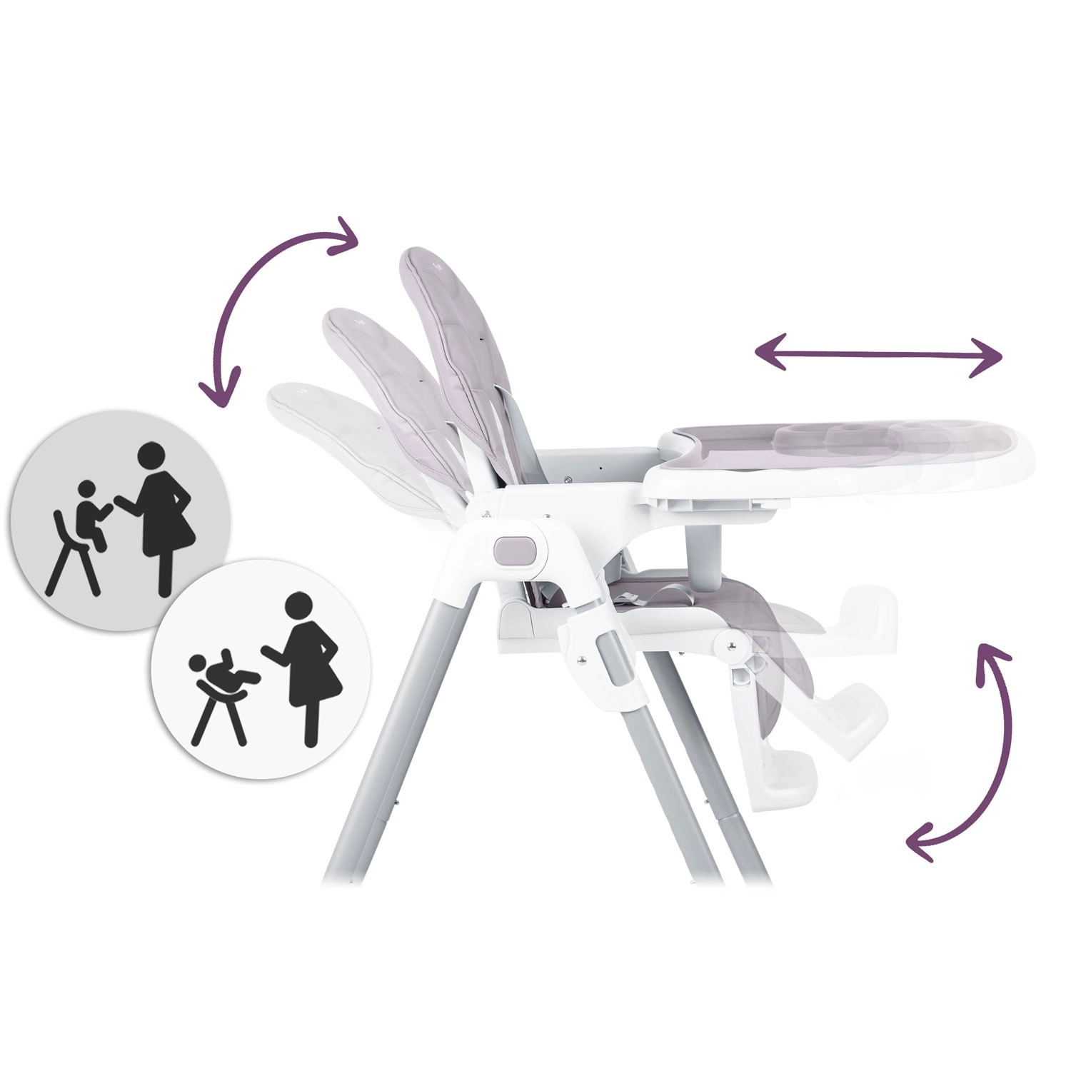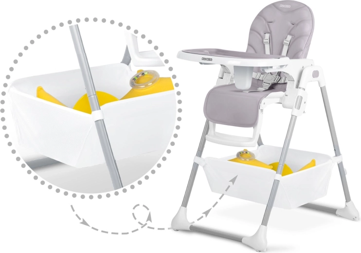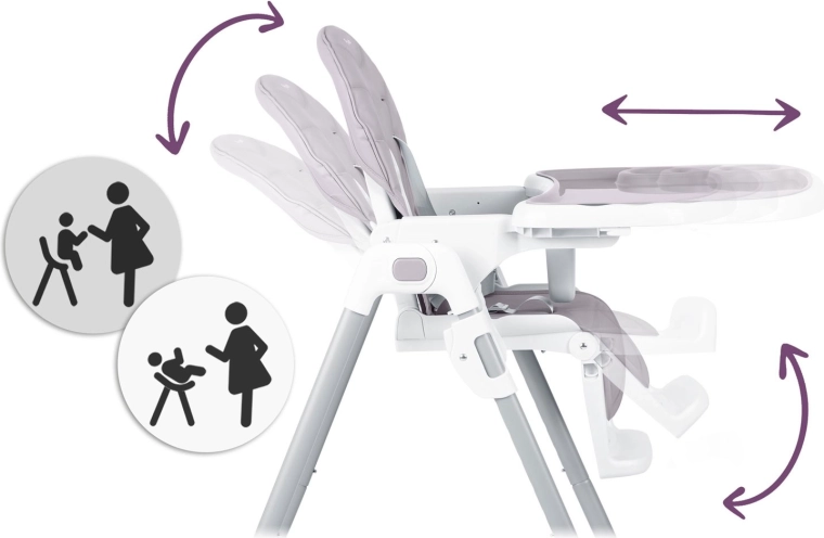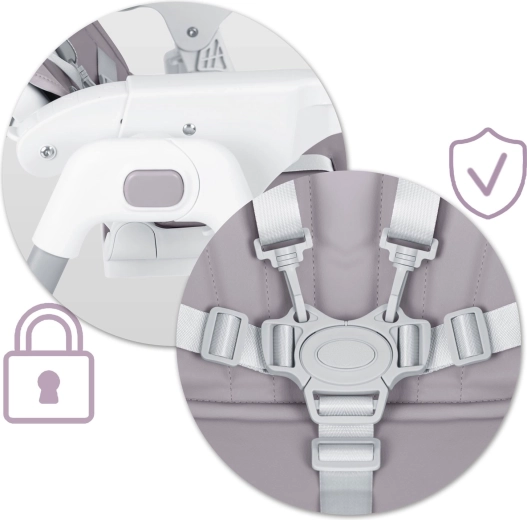 Højstolen vokser med barnet – justerbar højde, indstilling af bakke og fodstøtte sikrer ergonomisk siddestilling fra de første skemadsmåltider til tumlingealderen. Overholdelse af den strenge europæiske standard EN 14988 og 5-punkts seler garanterer sikkerhed ved hver brug.