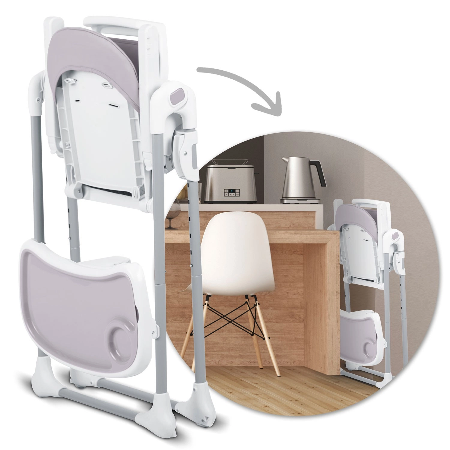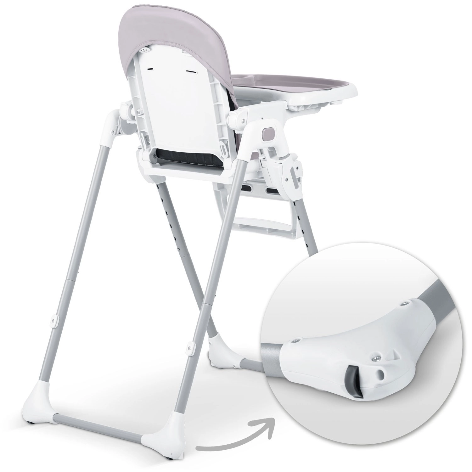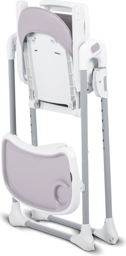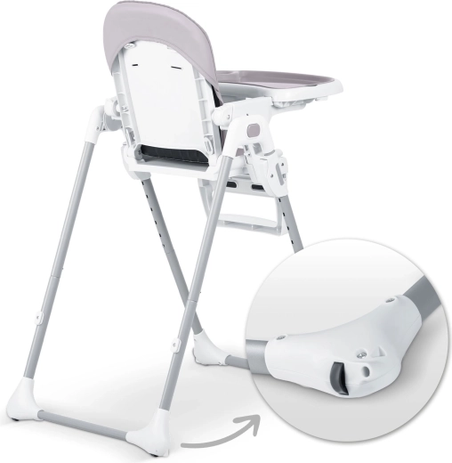 Højstolen kan klappes sammen på et øjeblik til et kompakt format. Den står frit selv i sammenklappet tilstand og opbevares nemt ved siden af bordet eller i skabet.
