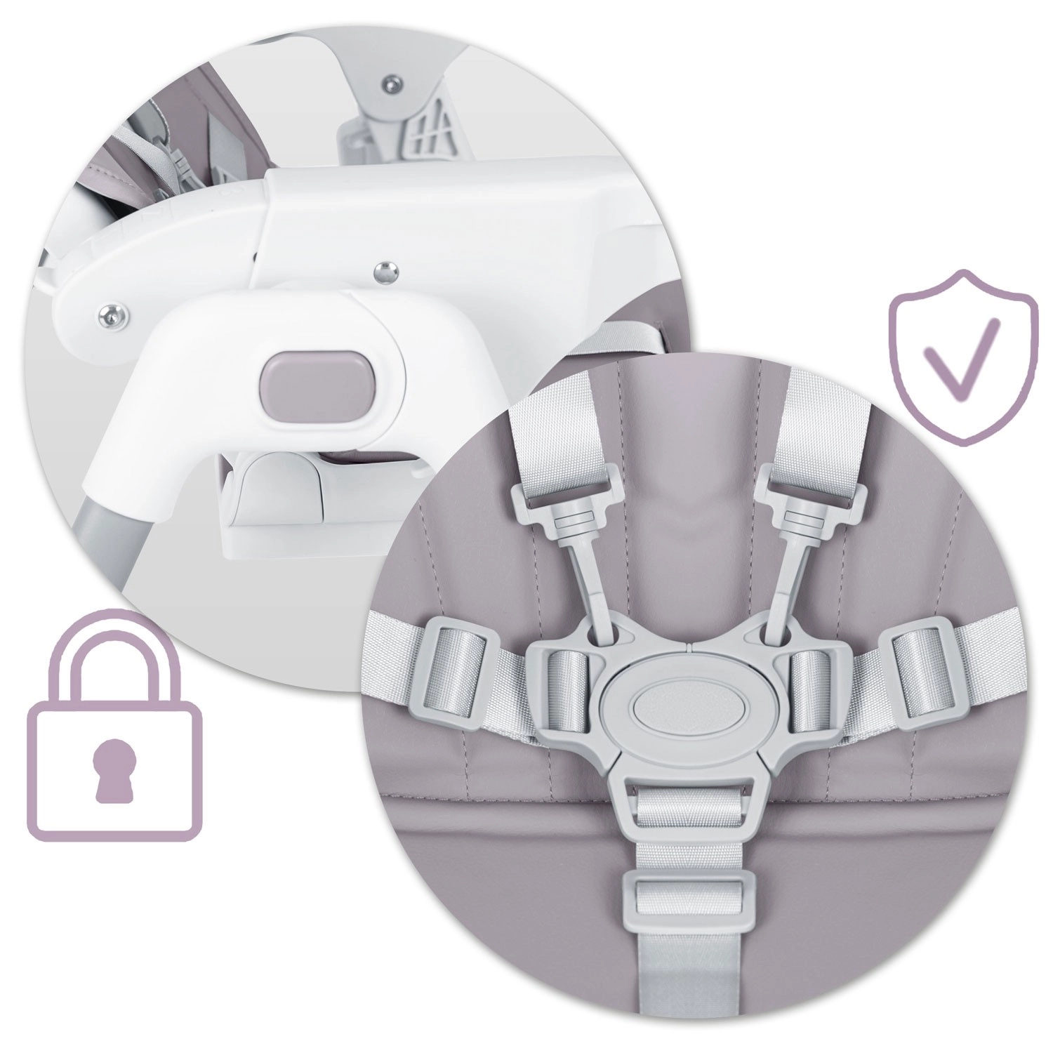 De fempunkts sikkerhedsseler og den stabile ramme sikrer, at barnet sidder trygt under både måltider og leg. Indstillinger og låse er let tilgængelige og pålidelige.