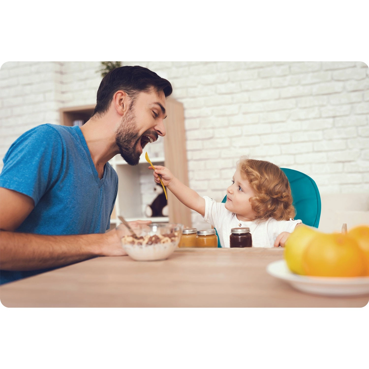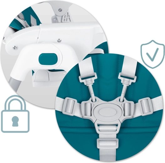 Fem-punkts seler med centralt spænde og en bred base holder barnet sikkert under både spisning og leg. Opfylder den europæiske standard EN 14988.