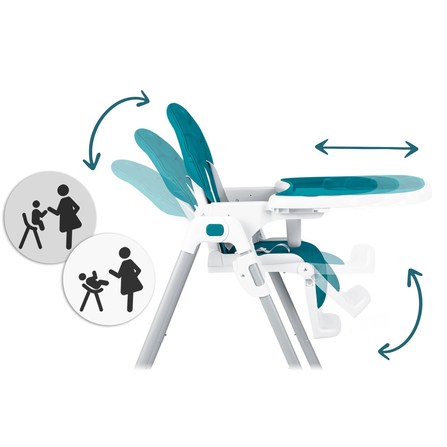 Den aftagelige dobbeltbakke med forhøjede kanter forebygger spild og kan nemt skylles under rindende vand eller vaskes i opvaskemaskinen. Justerbar afstand til bakken, sædehøjde og fodstøtte hjælper med at skabe en ergonomisk og komfortabel siddestilling for både tumlinger og større børn op til 15 kg. Baghjulene gør det lettere at flytte den rundt i hjemmet.