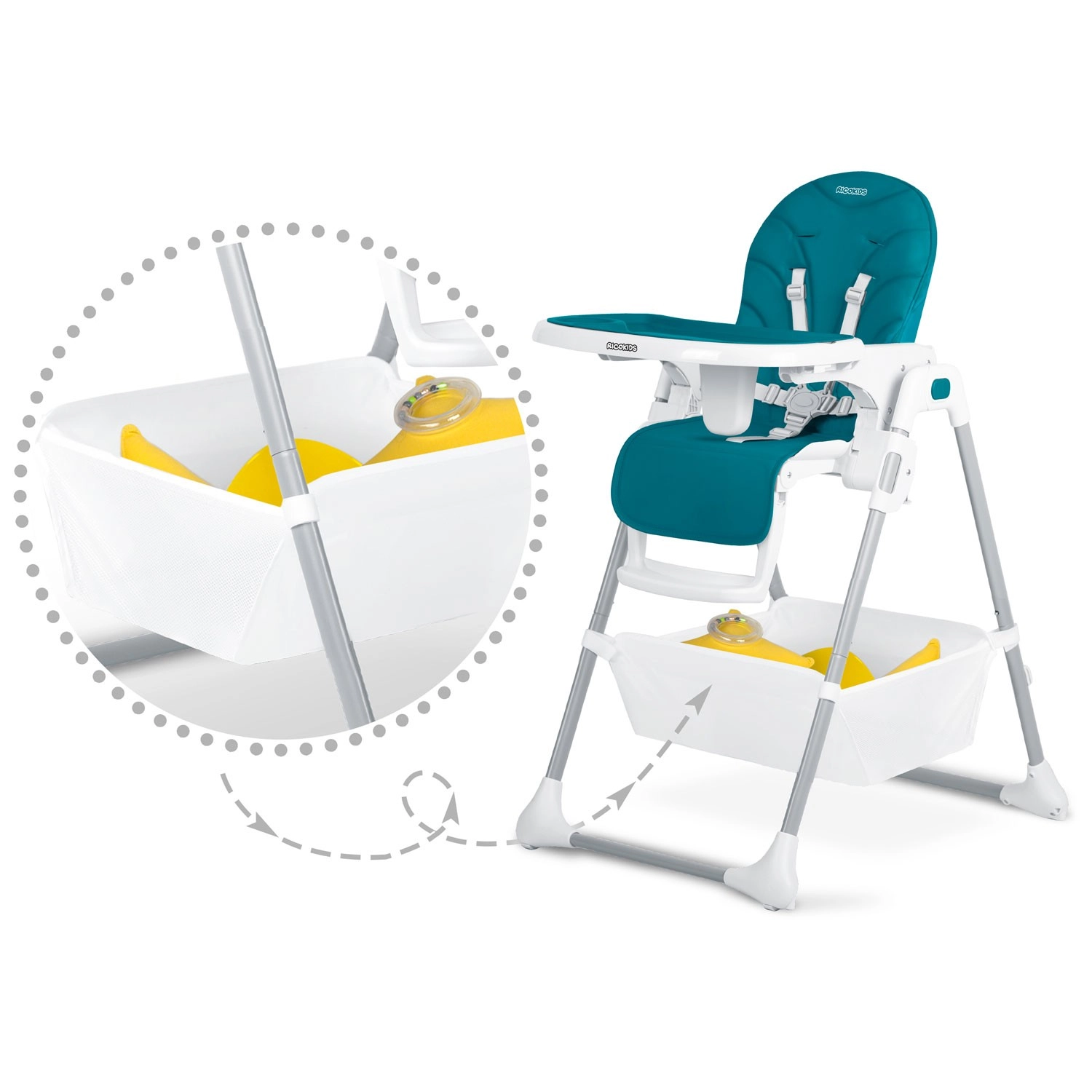Ricokids Tulo vokser med dit barn: fra de første mos til selvstændige måltider. Den robuste konstruktion med stabil base og fem-punkts sele sikrer tryghed, mens de bløde, smudsafvisende puder og aftørringsvenlige overflader gør oprydningen let efter hvert måltid. Takket være den kompakte sammenklapning kan stolen hurtigt stilles væk, når den ikke er i brug.