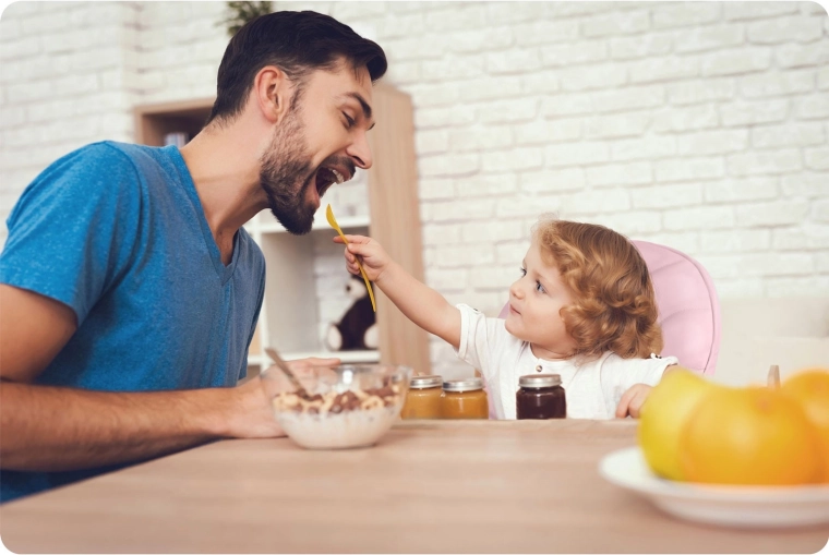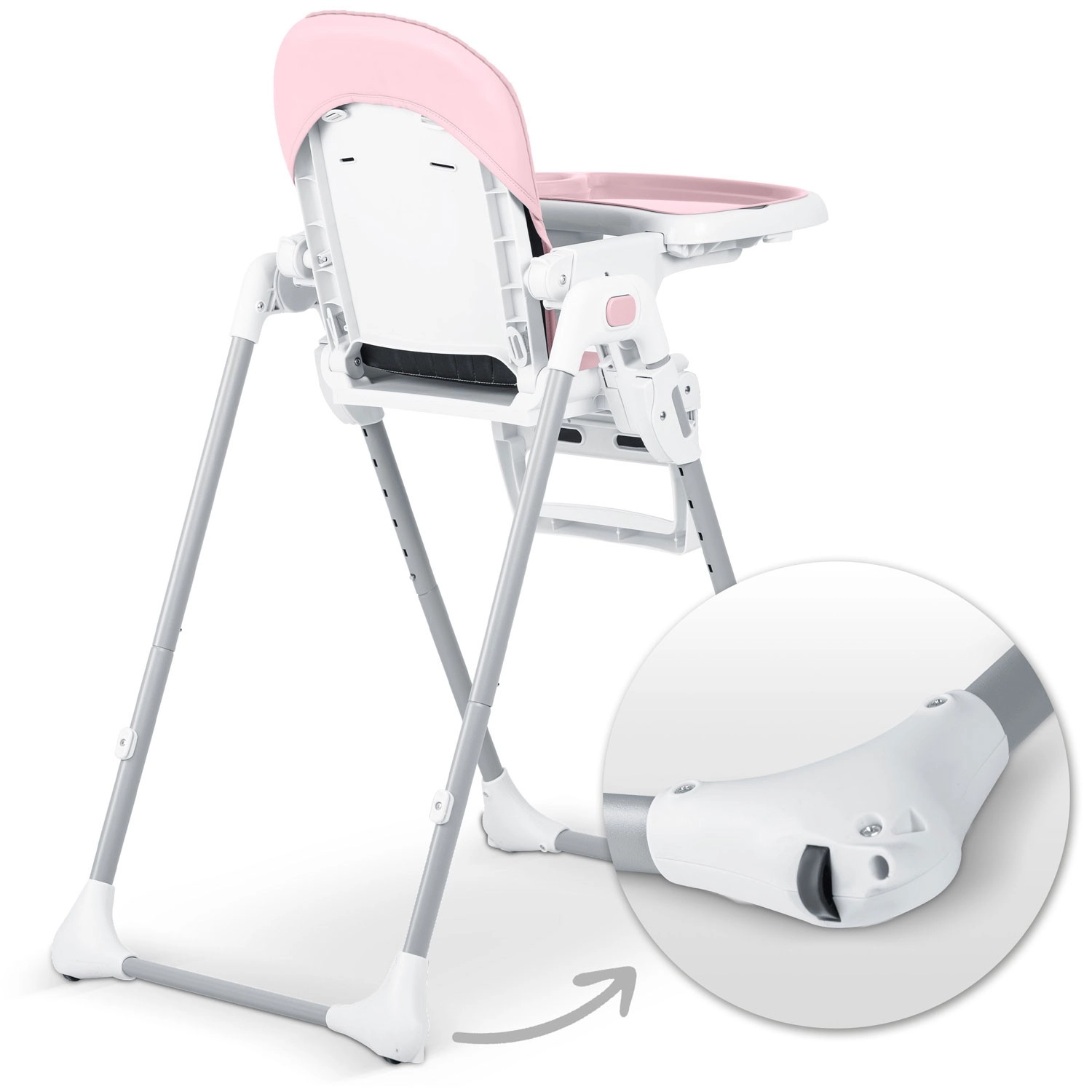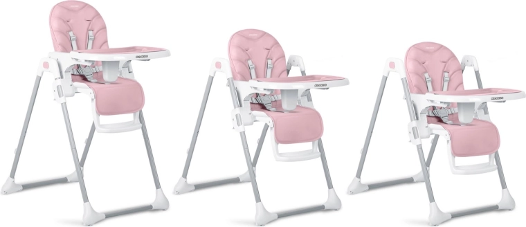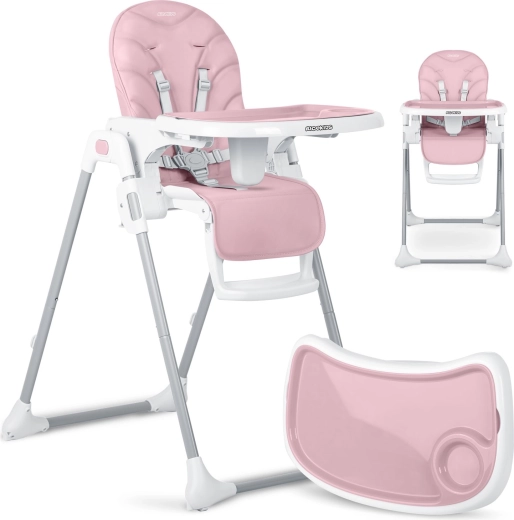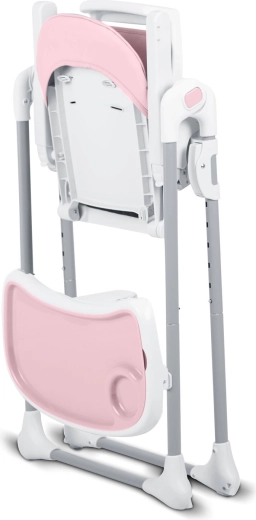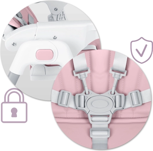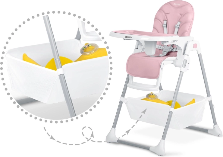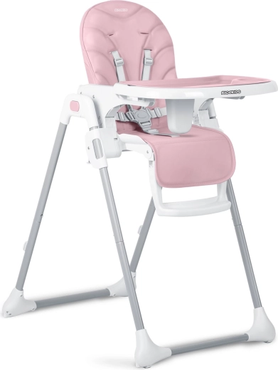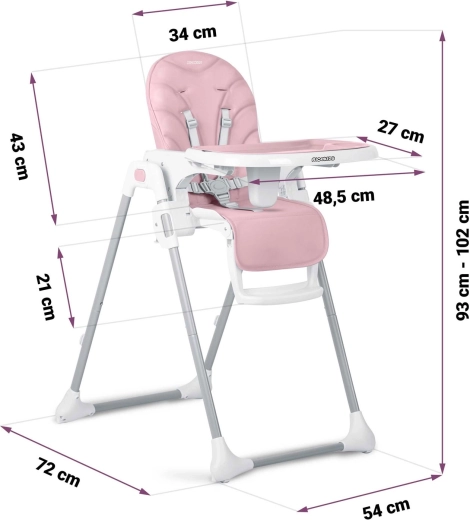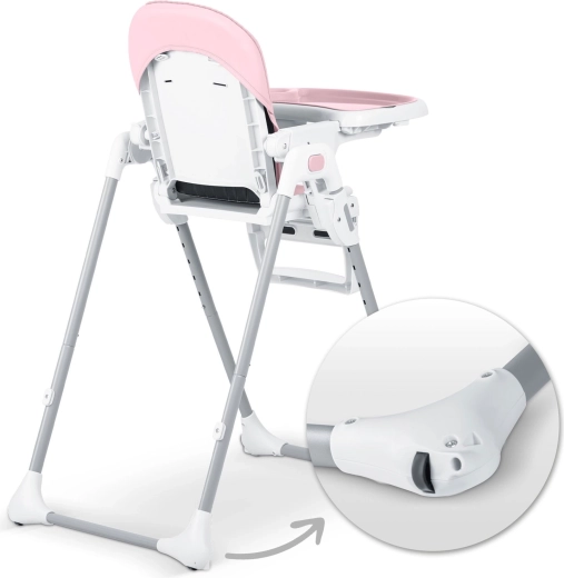 Stolen klappes hurtigt sammen til et kompakt format for nem opbevaring og har baghjul for bekvem flytning. Fem-punkts seler og en stabil metalramme med brede ben sikrer høj sikkerhed og ro under måltider og leg.