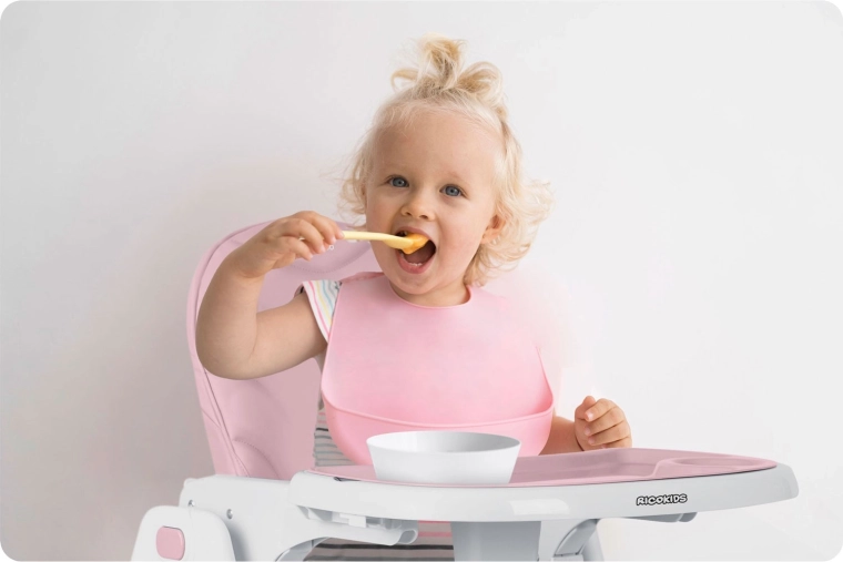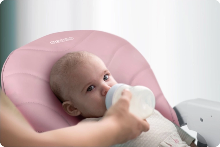 Flere positioner af ryglænet, justerbar fodstøtte og en skydbar bakke sikrer korrekt siddestilling både under måltider og hvile.
