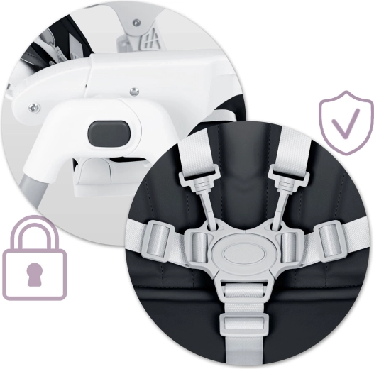 Takket være den robuste ramme, den brede base og 5-punktsseler i henhold til EN 14988 sidder barnet fast og sikkert under både måltider og leg.
