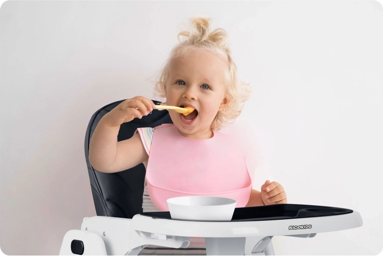 Højstolen RICOKIDS Tulo vokser med barnet, og takket være den aftagelige bakke kan den bruges ved bordet også til et større barn. Den stabile konstruktion med bred base, 5-punktsseler i henhold til EN 14988 og skridsikre fødder sørger for sikker siddeplads under måltider såvel som leg.