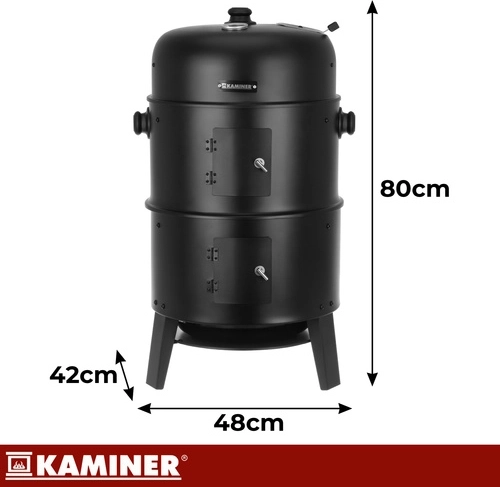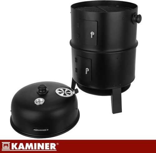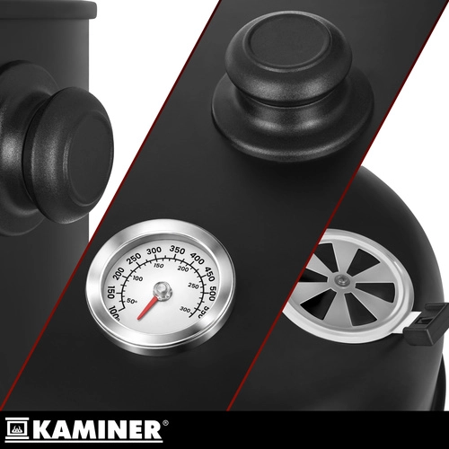 Opdag den alsidige KAMINER 3-i-1 grill, som kombinerer grillning, røgning og bålsted i én. Takket være termometer i låget, lufttilførselsregulering og to forkromede riste på 38 cm tilbereder du saftige bøffer og aromatiske pølser med minimal indsats. 8 kroge til røgning, robust stålkonstruktion på 0,9 mm og nem rengøring gør den til et ideelt valg til enhver BBQ.