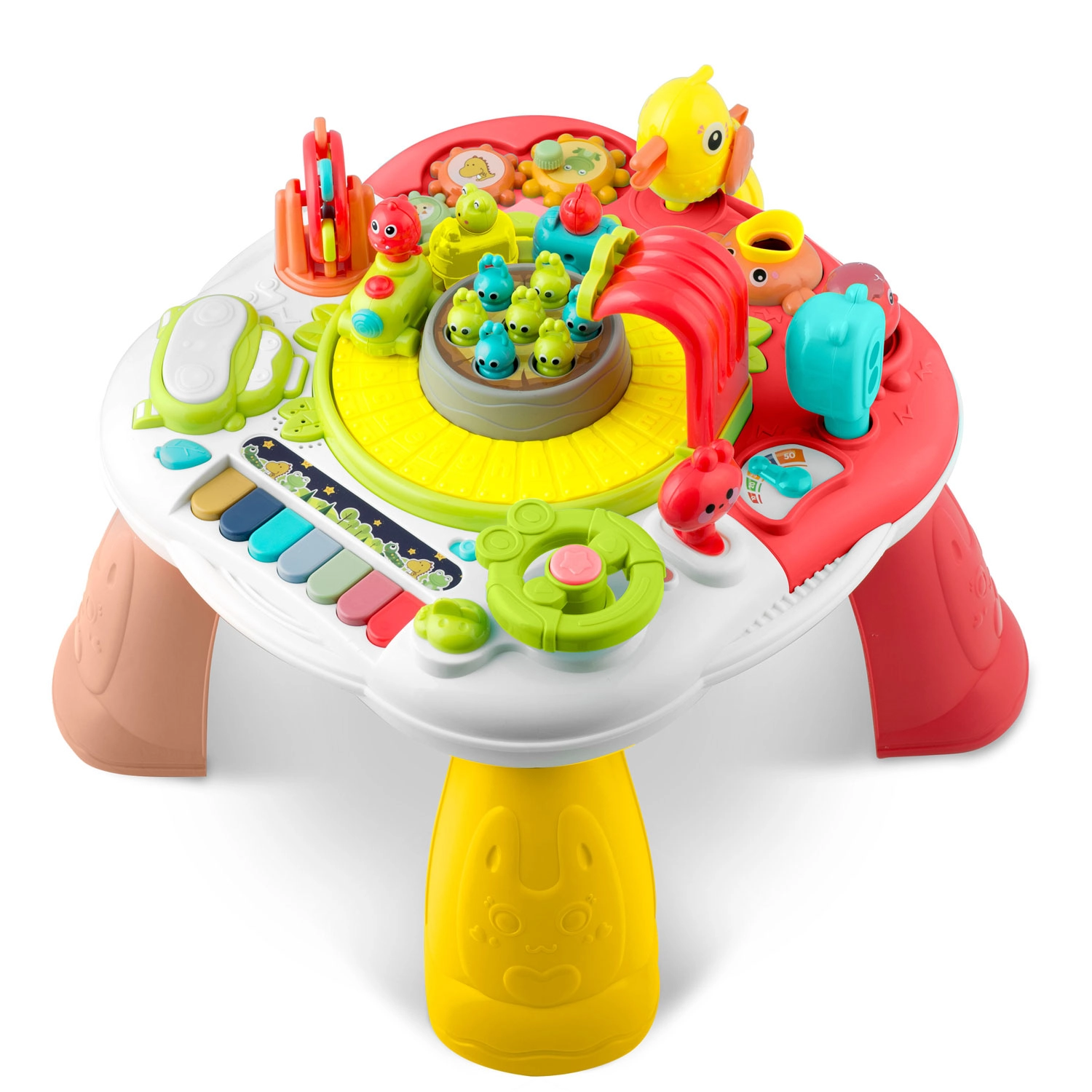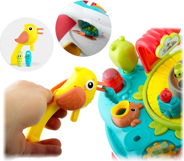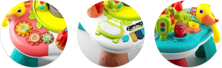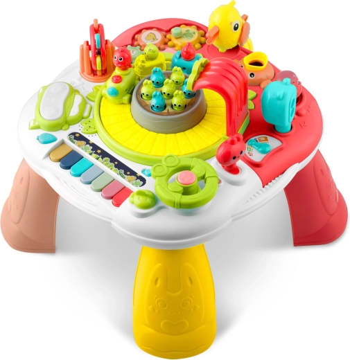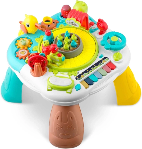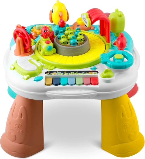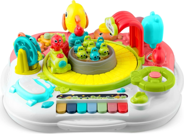 En sjov og smart ledsager til børn fra 18 måneder: et interaktivt bord med aftageligt panel, der også fungerer som læringstavle. Det tilbyder lys- og lydelementer, et farverigt klaver, et automatisk tog, en roterende karrusel, tandhjul og en række knapper og håndtag til at udvikle finmotorik, logik og farvelære. Stabil konstruktion, hurtig montering og to-trins lydstyrkekontrol vil glæde både børn og forældre.
