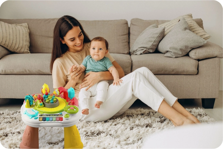 Det interaktive bord og tavle i ét kombinerer leg og læring. Det aftagelige panel kan bruges på gulvet eller, når benene monteres, som et fritstående bord. Barnet nyder lys, musik, bevægelige elementer og klaverspil, mens øje-hånd-koordination trænes, og farver samt årsag–virkning læres.