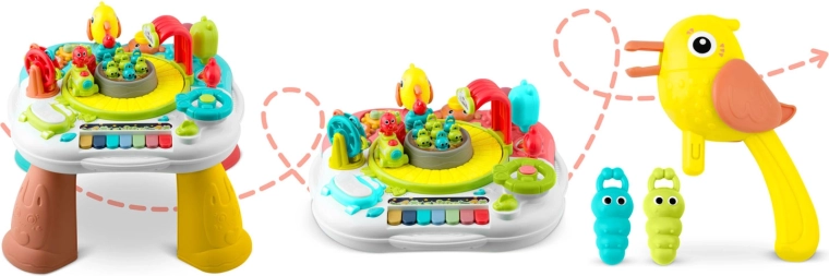 Sættet indeholder også et automatisk tog, der kører af sig selv og fanger opmærksomheden, en karrusel og en lysgivende lille bil. Legen “fodre fugleungen med orme” understøtter greb og præcision. Forældre vil sætte pris på muligheden for helt at slukke lyden og 2 lydstyrkeniveauer samt den solide udførelse og nemme montering.