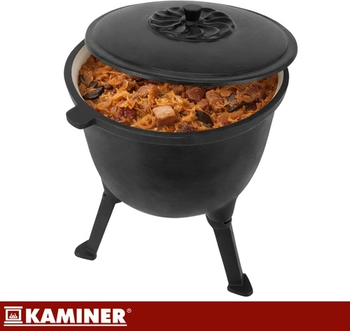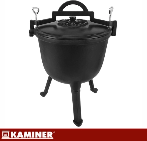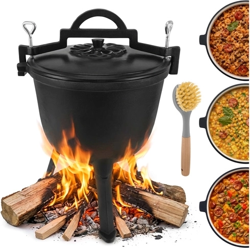 Den tykvæggede støbejernskonstruktion lagrer varme for jævn simring af gullasch, supper og andre one-pot specialiteter over flammer eller glødende kul.