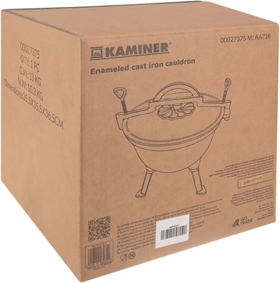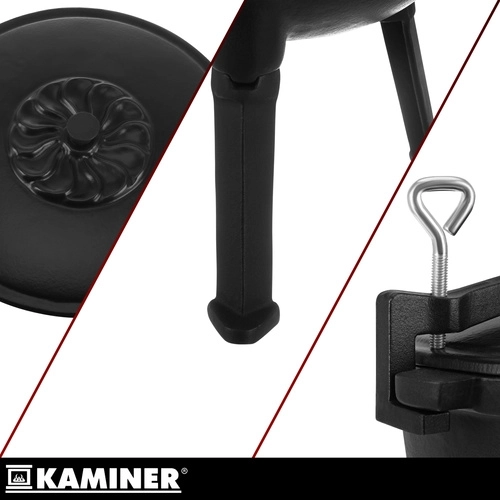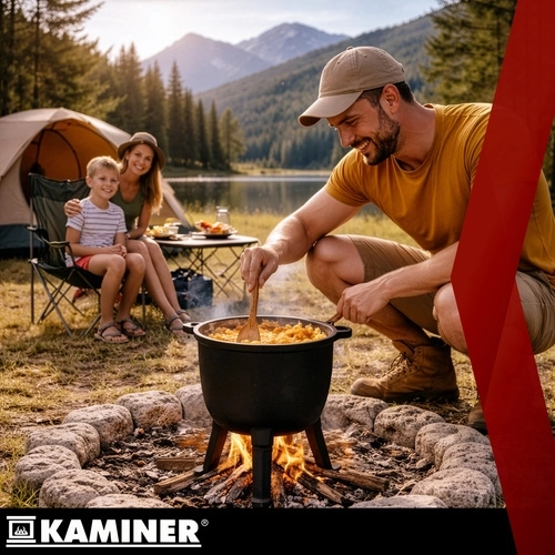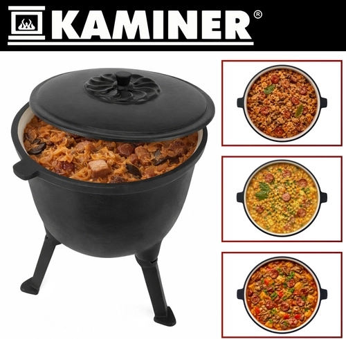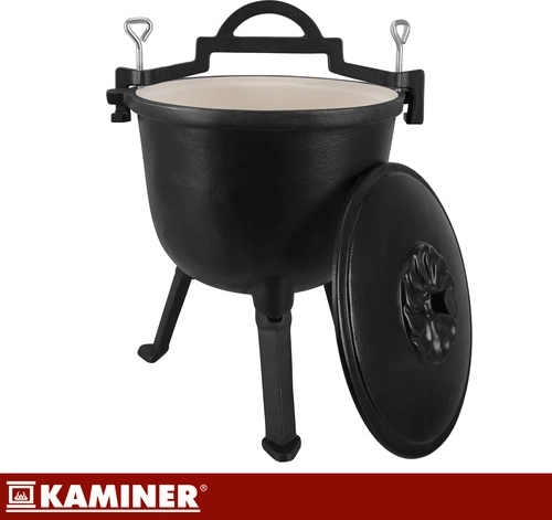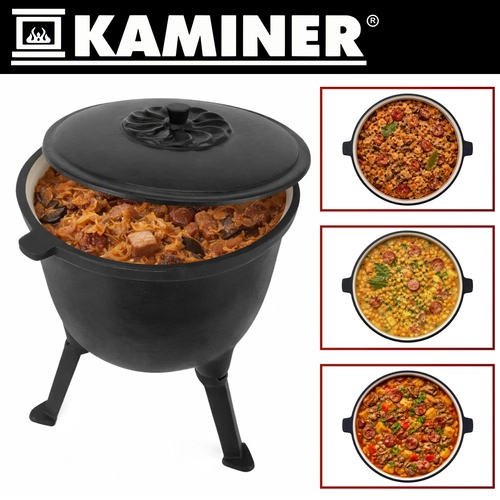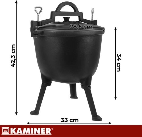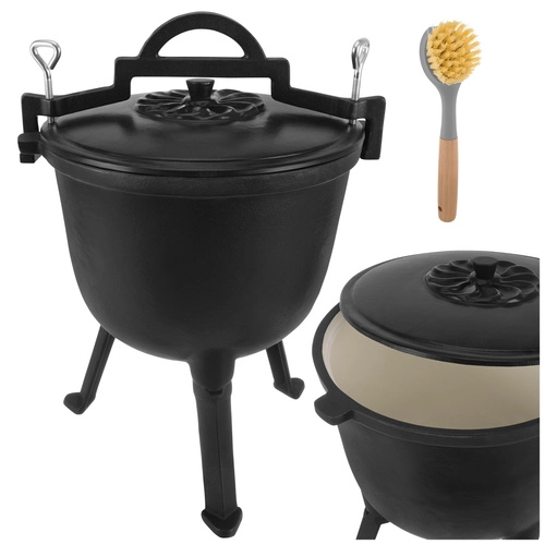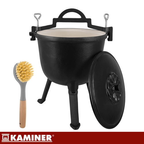 Robust støbejernsgryde på 8 l fra KAMINER er ideel til udendørs madlavning over åben ild. Takket være jævn varmefordeling og emaljeret inderside brænder maden ikke på, og rengøringen er nem. Aftagelige ben sikrer stabilitet i ildstedet, låg med greb holder på varmen, og den praktiske øverste bøjle gør det let at bære og hænge den over gløderne. I sættet medfølger også en rensebørste.