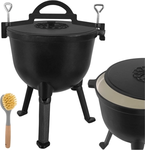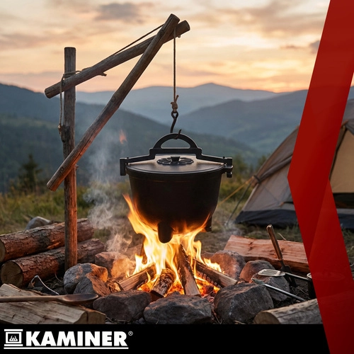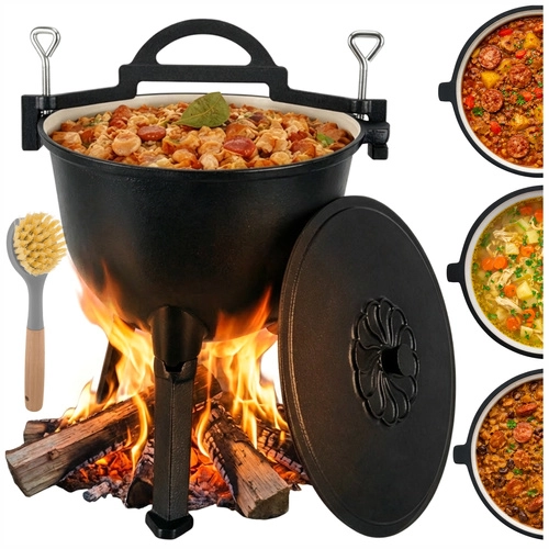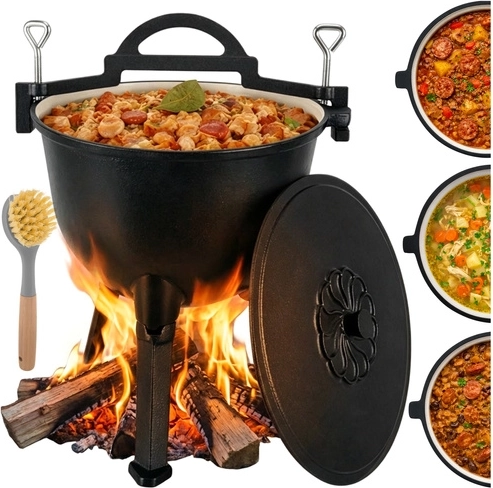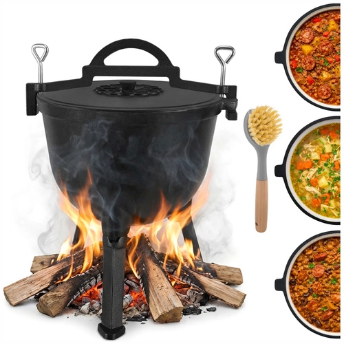 Ideel til one-pot retter som gullash, lecsó, bønnegryde, borsjtj eller supper. Jævn varmeledning minimerer risikoen for, at maden brænder på, og låget hjælper med at bevare saftighed og aroma. Afskaffelige ben sikrer stabilitet i ildstedet og kompakte mål ved opbevaring, mens øverste bøjle med håndtag gør det muligt at hænge den på krog eller over bålstativ.