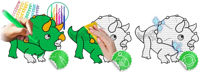 Den særlige aftørringsbare overflade gør det muligt at tegne med almindelige tuscher, som tørrer hurtigt. Det er nok at tørre af med en fugtig klud og starte forfra – børnehænder og rum forbliver rene.