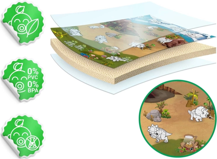 Den store rullebare farvelægningsmåtte RICOKIDS af kvalitets EVA-skum giver børn en blød og sikker overflade, genanvendeligt aftørringsbar til uendelig kreativitet. Pakken indeholder tuscher GRATIS, tegningerne tørrer hurtigt, og måtten rengøres nemt blot med en fugtig klud. Den er vandafvisende, termisk isolerende, holdbar og opfylder europæiske sikkerhedsstandarder EN71 samt har CE-certificering.