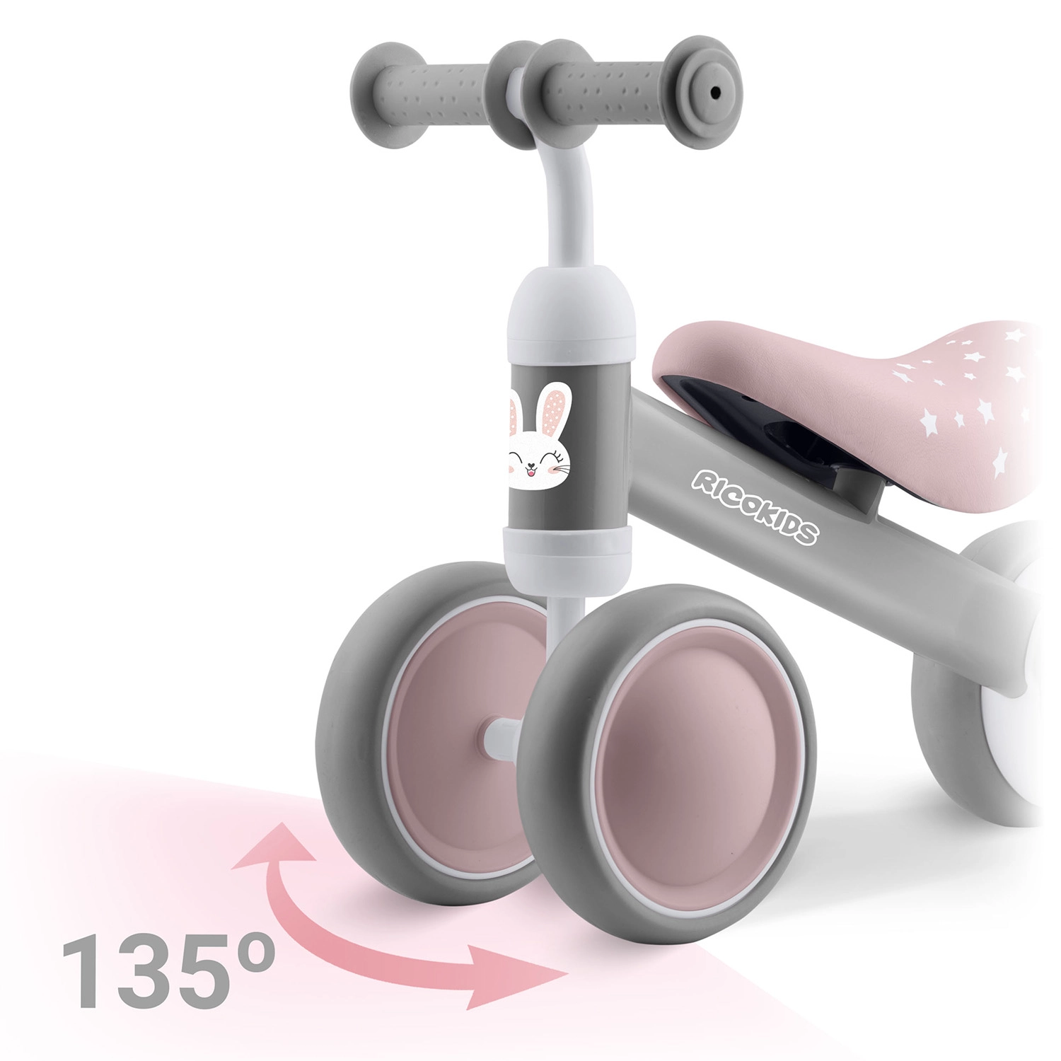 Den begrænsede styrevinkel forhindrer pludselig overdrejning og hjælper med at opretholde bedre kontrol og balance i de allerførste forsøg. Skumsædet og gummigreb med stoppere sikrer komfort og et sikkert greb for små hænder. Det minimalistiske design og de kompakte mål glæder både forældre og børn.