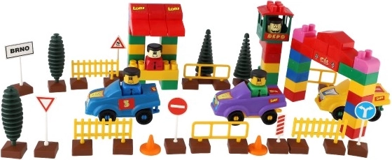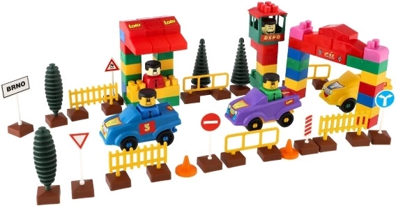 Byggesættet indeholder realistiske elementer, der simulerer et trafikmiljø til leg, som biler, træer og trafikskilte.
