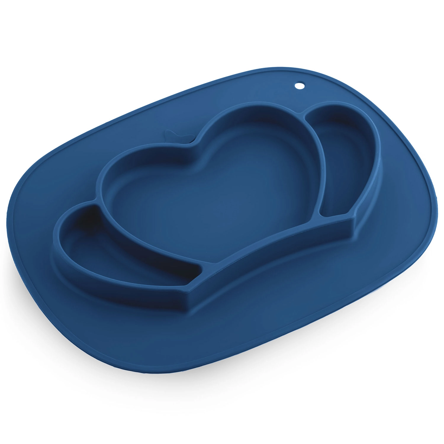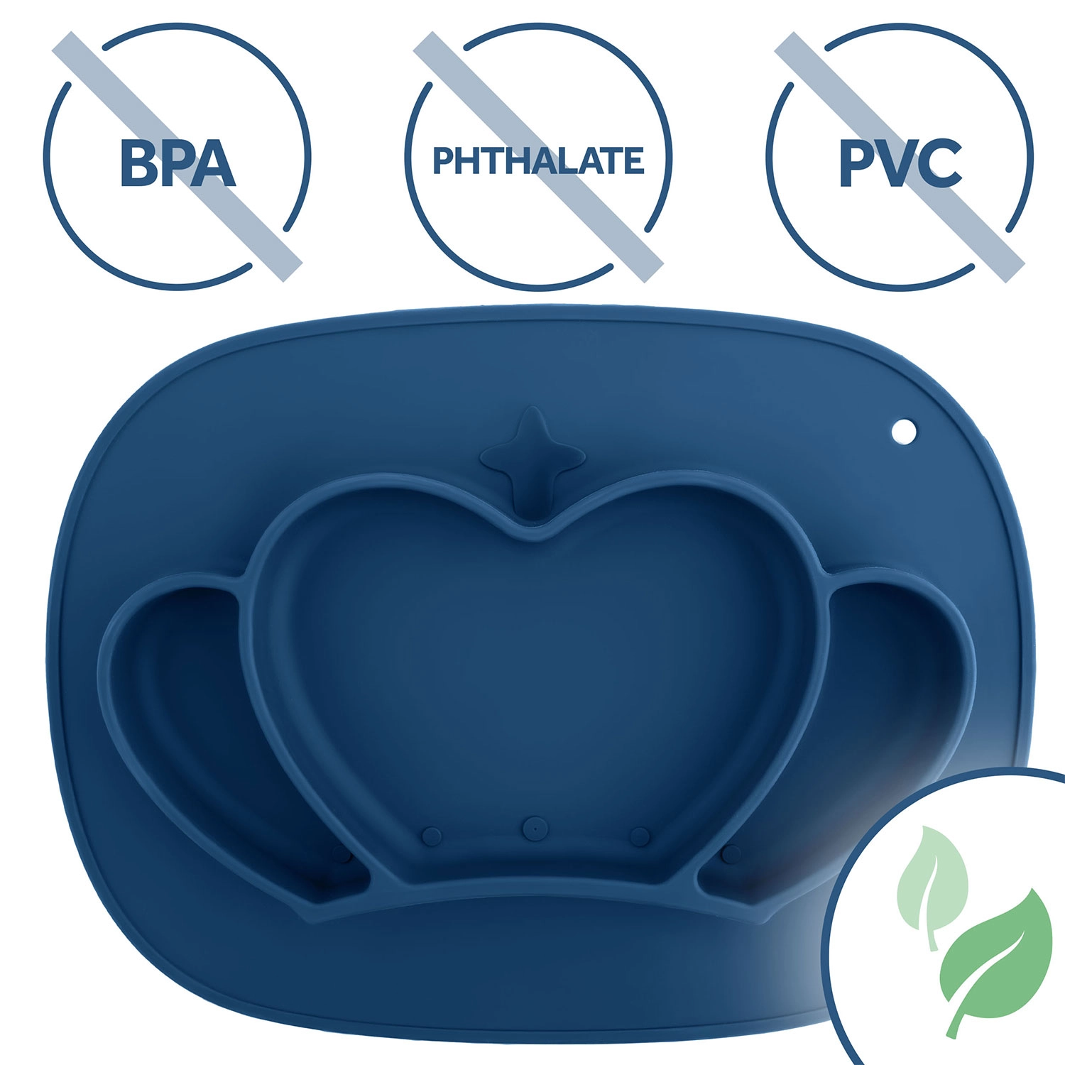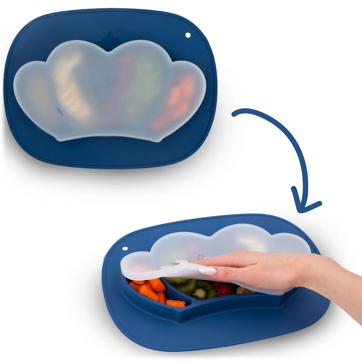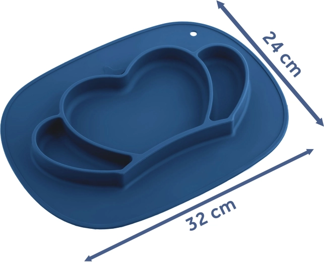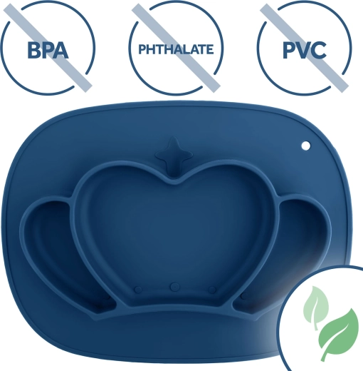 Praktisk silikone-tallerken til børn med kroneform og tre rum sikrer mindre rod og mere glæde ved måltidet. Takket være den klæbende base står den fast på bordet, har sikker udførelse 100 % BPA-fri, er egnet til opvaskemaskine, mikroovn og ovn, og leveres med et fleksibelt låg til at bevare friskheden og gøre det nemt at tage med på farten.