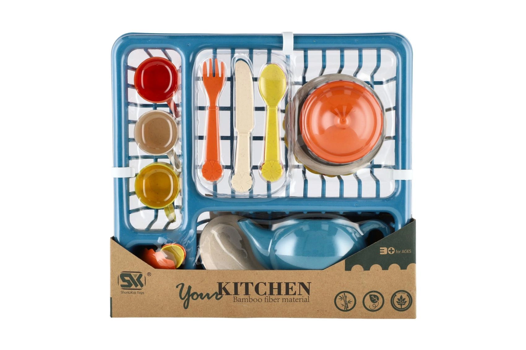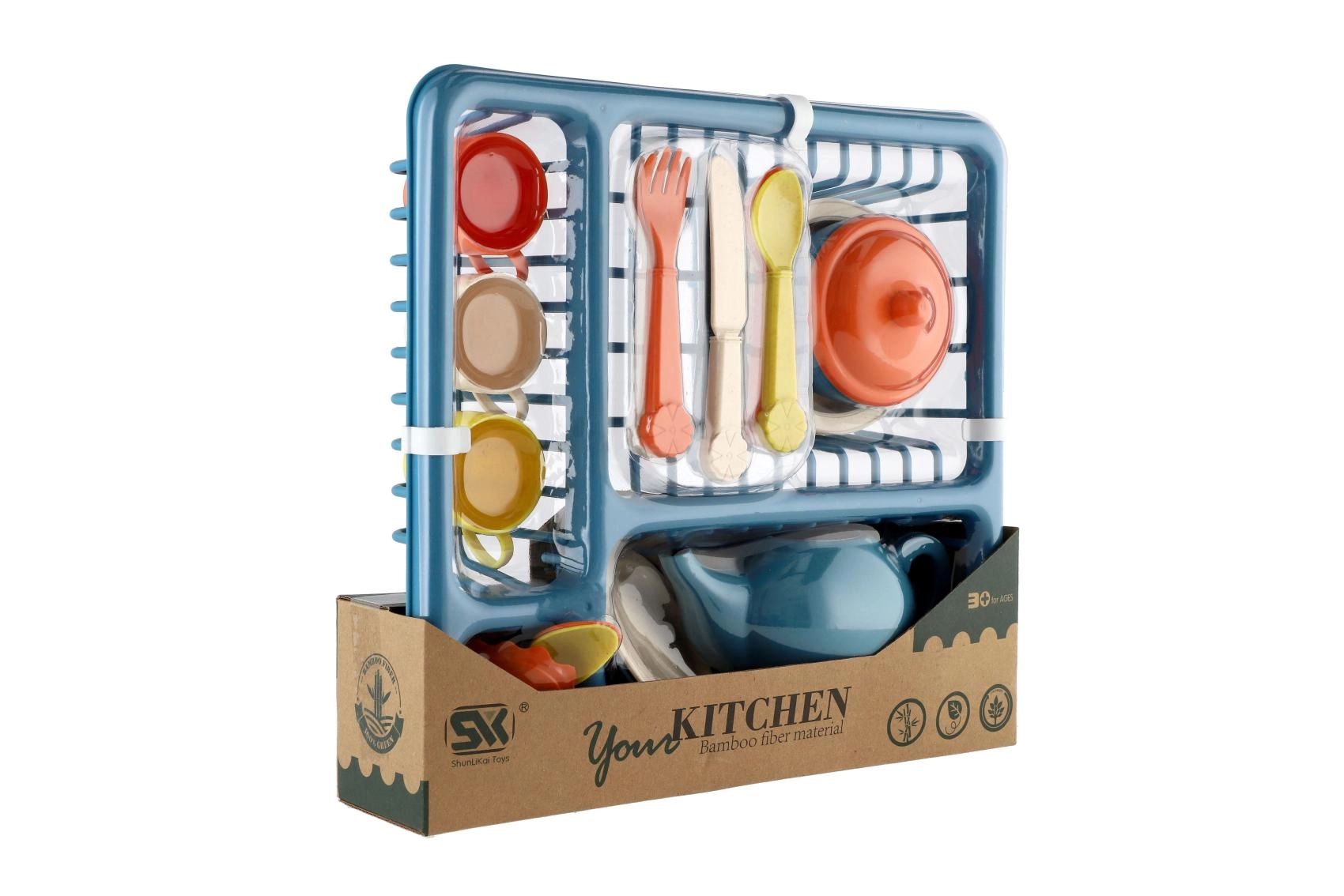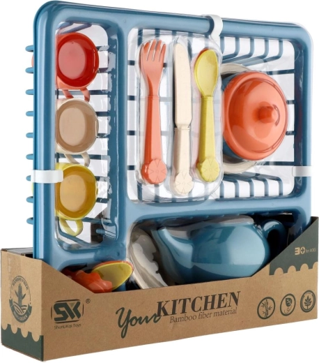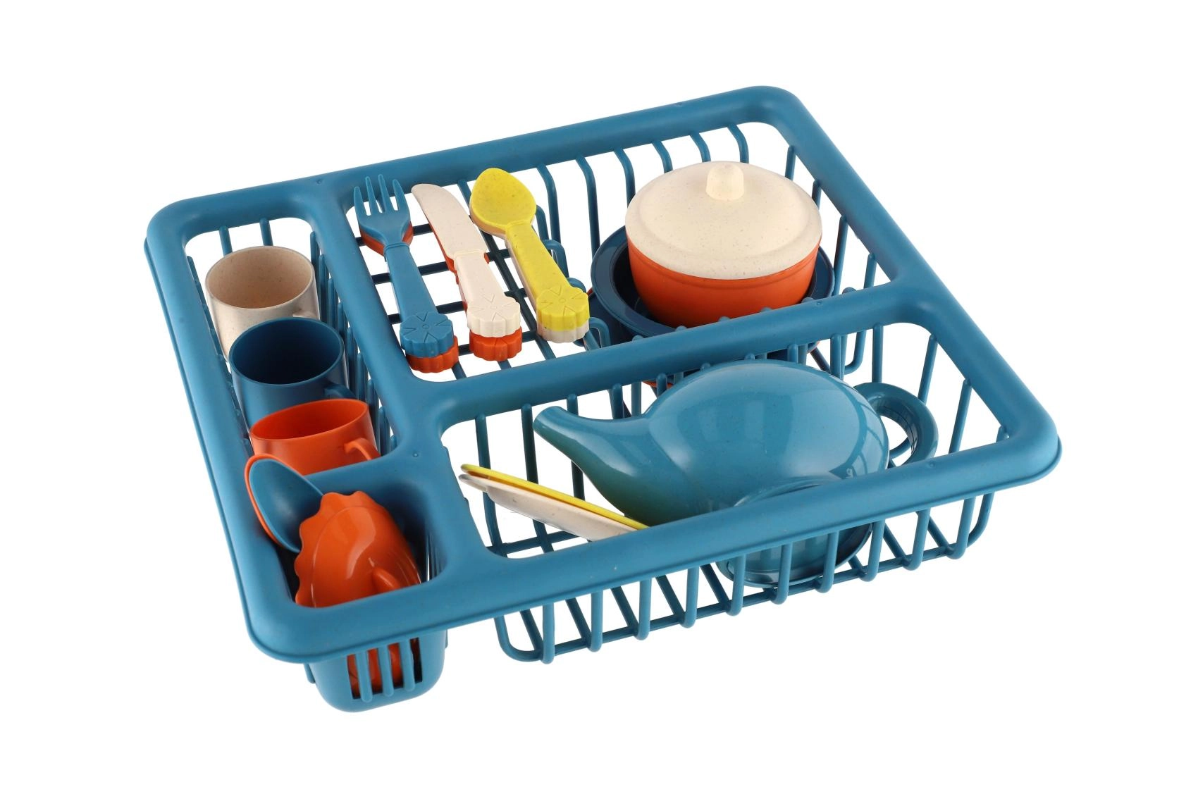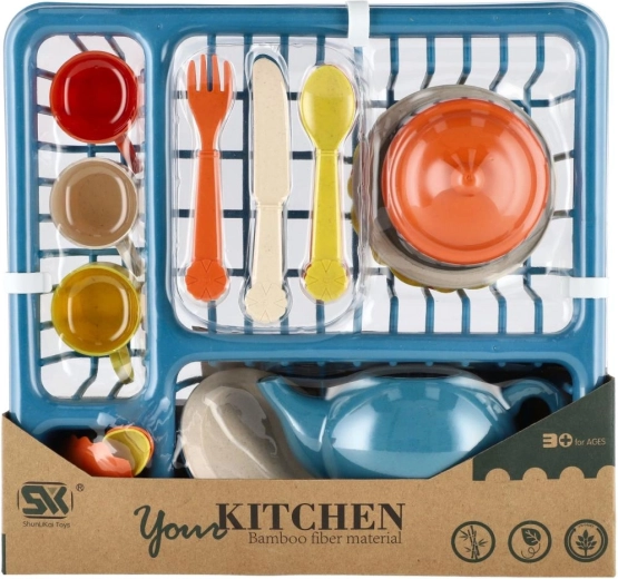 I pakken findes alt, hvad der er brug for til rolleleg – fra tekande med låg til tallerkener og skåle samt skeer, gafler og knive. Det praktiske stativ/opvaskestativ hjælper med at holde orden og lærer børn grundlæggende organisering.
