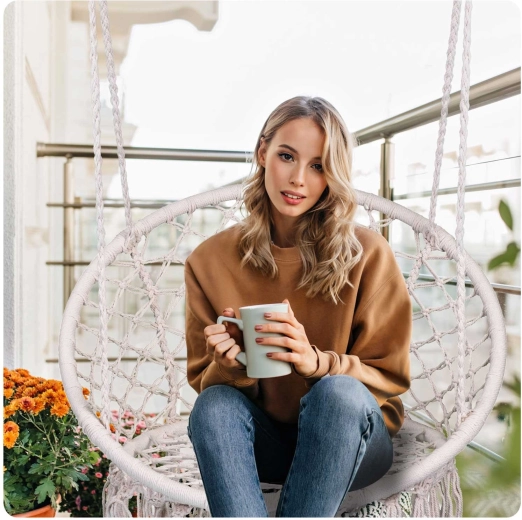 Det brede sæde og det højere ryglæn giver komfort ved læsning, arbejde og afslapning. Den luftige macramé-flet er behagelig og ventilerer godt.