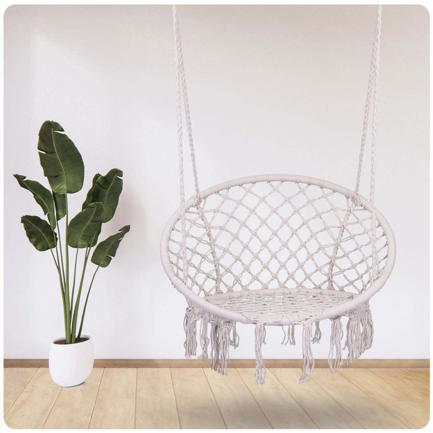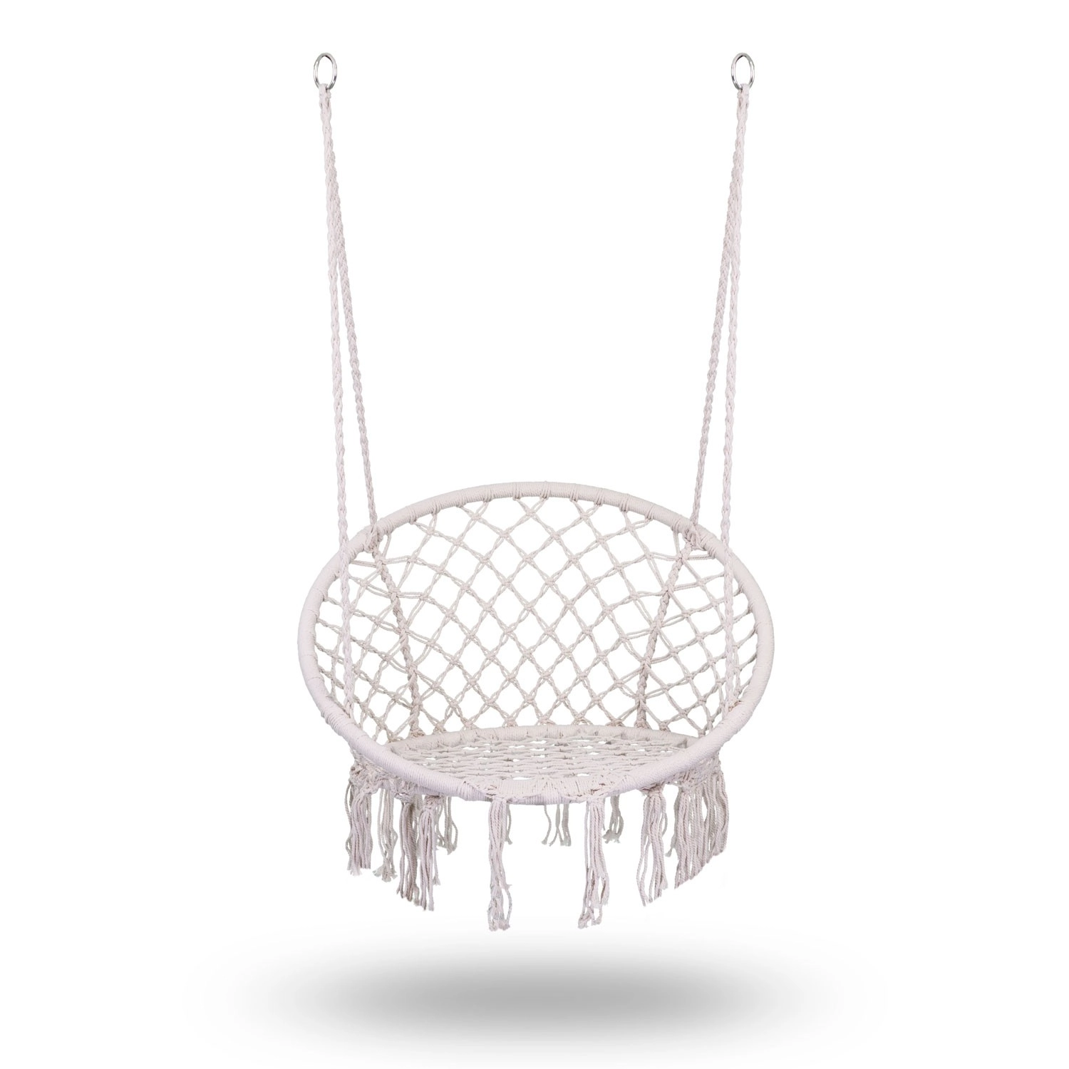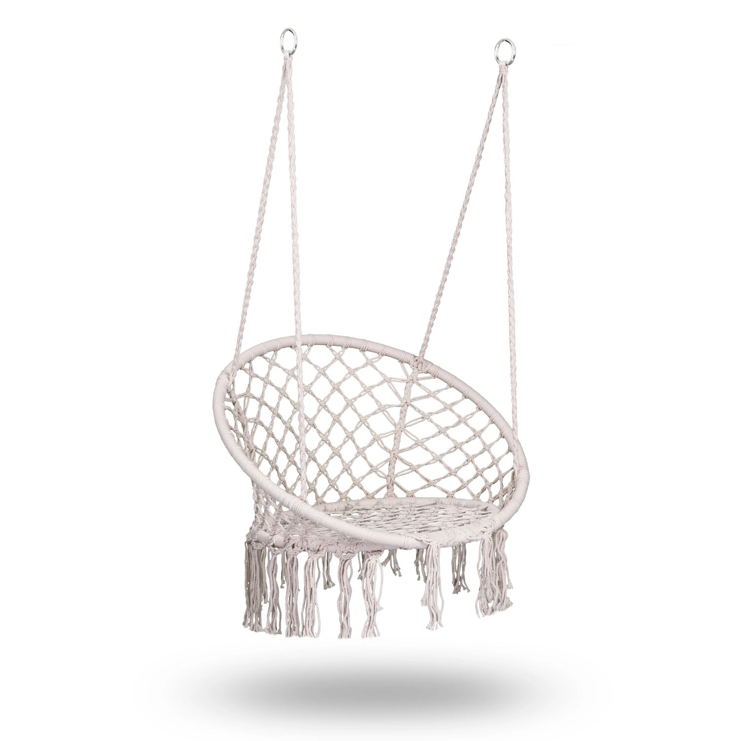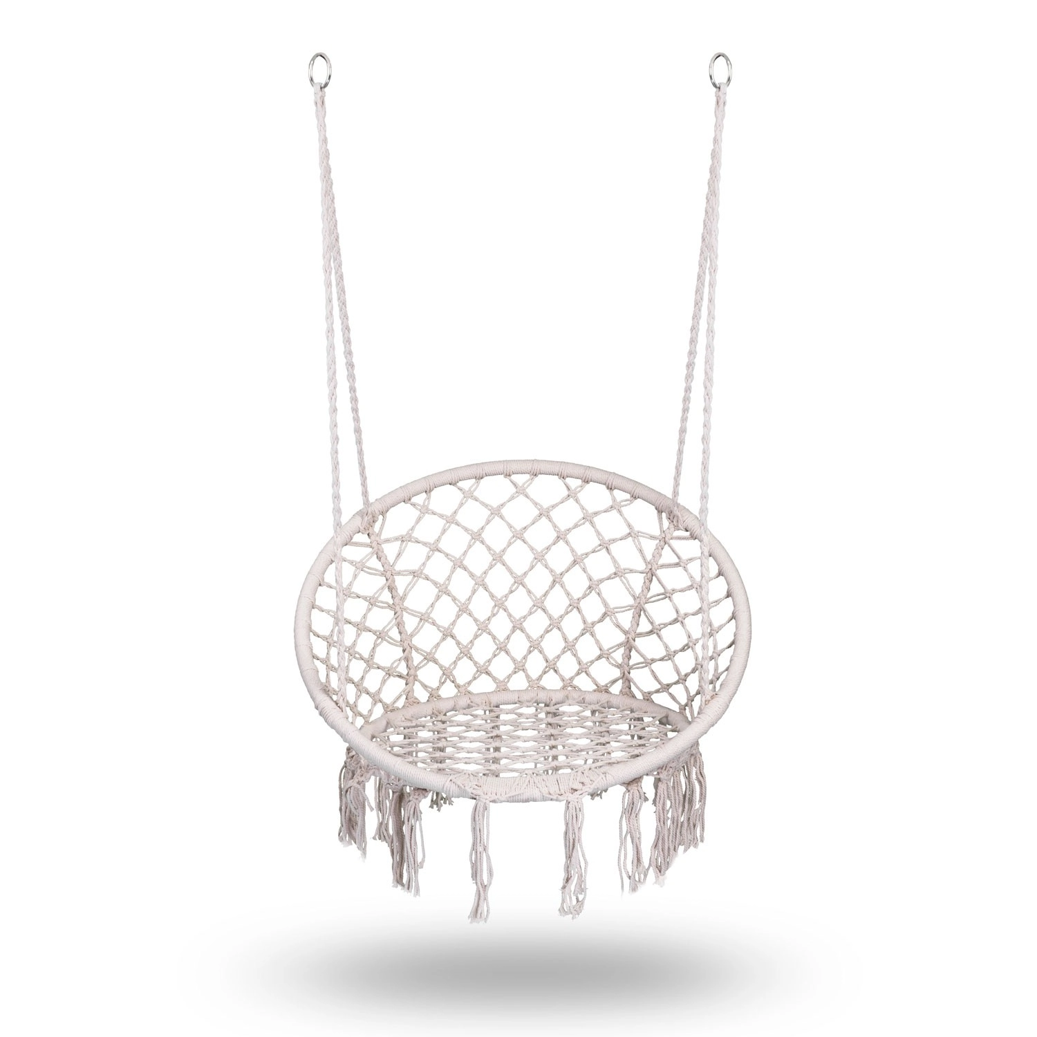 Nyd afslapning og komfort i en elegant boho hængestol i beige. Den robuste metalkonstruktion, dobbeltflettede ophængsreb og bæreevne op til 150 kg sikrer sikker gyngen både inde og ude. Det brede sæde, det høje ryglæn og de stilfulde macramé-frynser giver både dit interiør og din terrasse en særlig atmosfære.