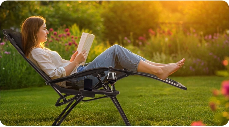 Den justerbare ryglænsvinkel lader dig løfte benene op i højde med hjertet, forbedre cirkulationen og reducere belastningen på rygsøjlen. Ideel til lang, behagelig hvile.