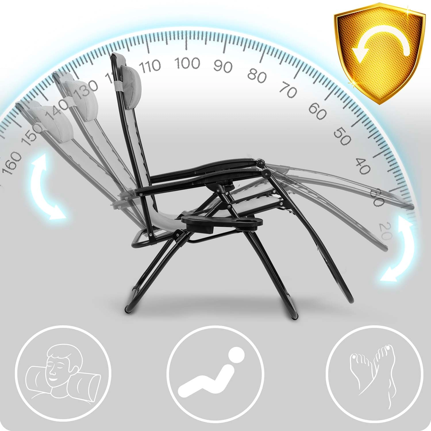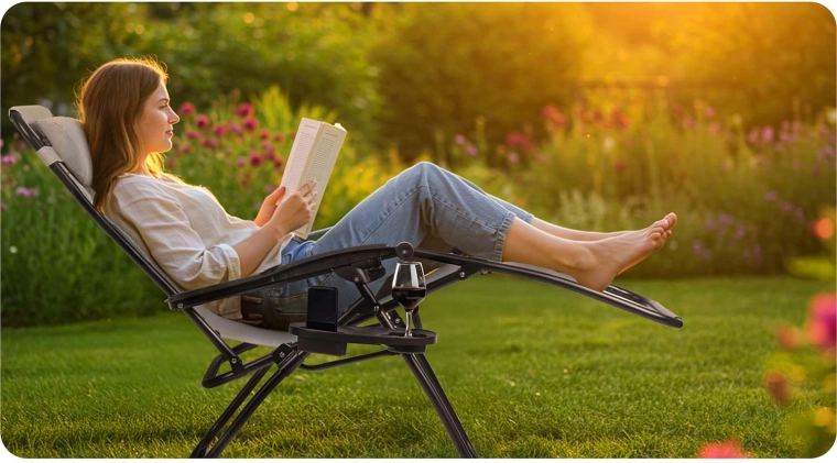 Den justerbare hældning løfter benene i niveau med hjertet, hvilket mindsker trykket på rygsøjlen og forbedrer blodomløbet. Ideel til dyb afslapning i haven eller på terrassen.