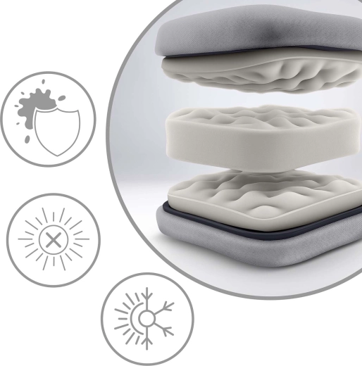 Den bløde og elastiske pude med aftagelig nakkestøtte giver behagelig støtte til hoved og nakke, er modstandsdygtig over for krøl og skånsom mod huden.