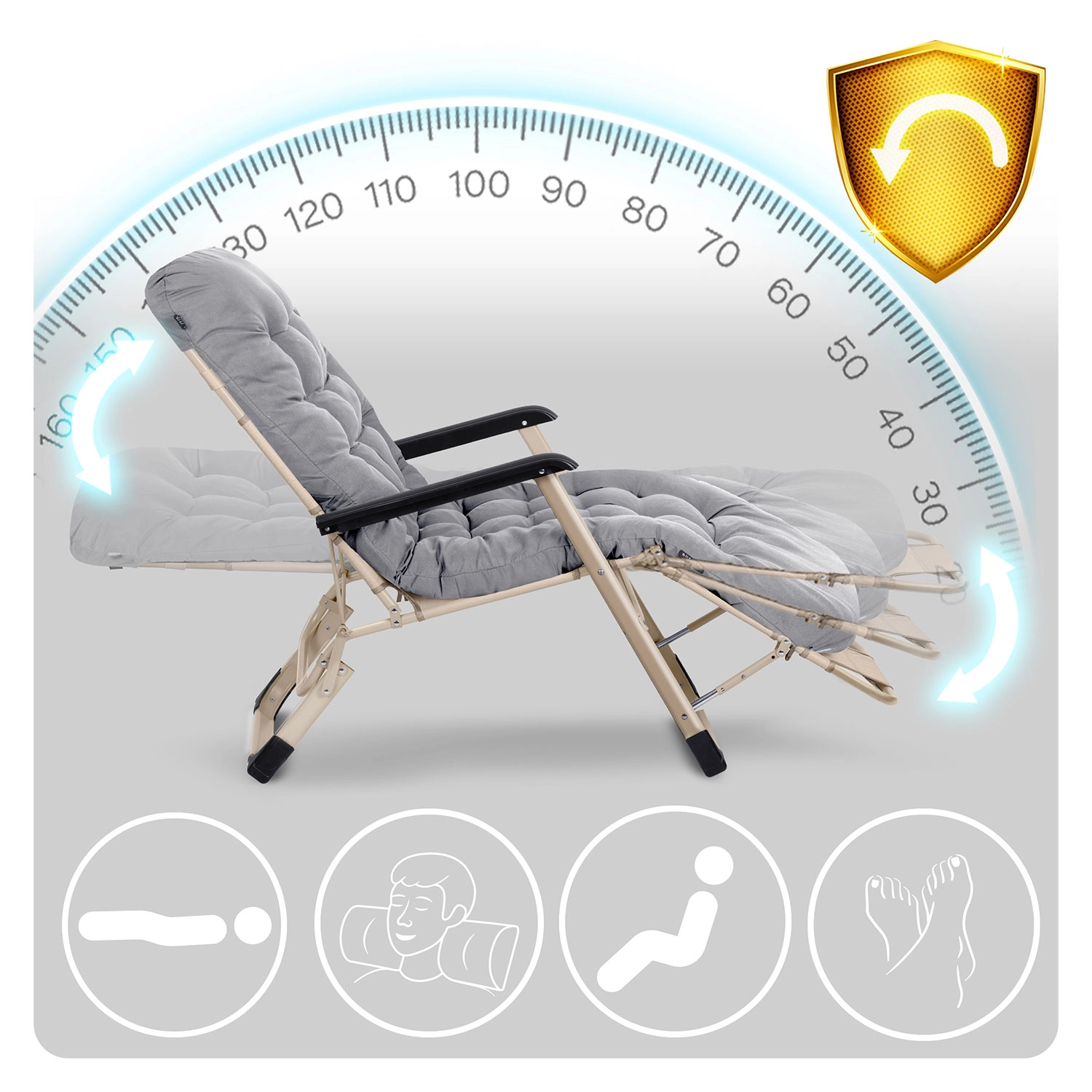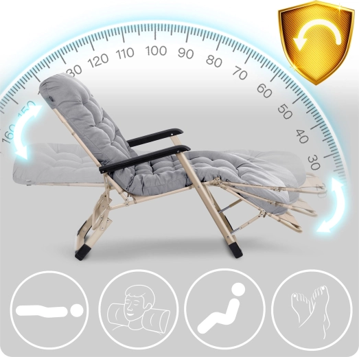 - Fleksibel afslapning: justerbart ryglæn og 3‑trins fodstøtte helt ned til liggende position.