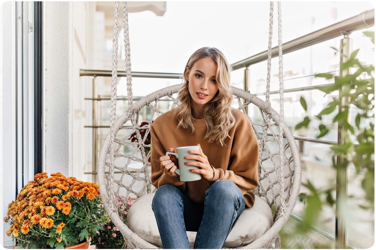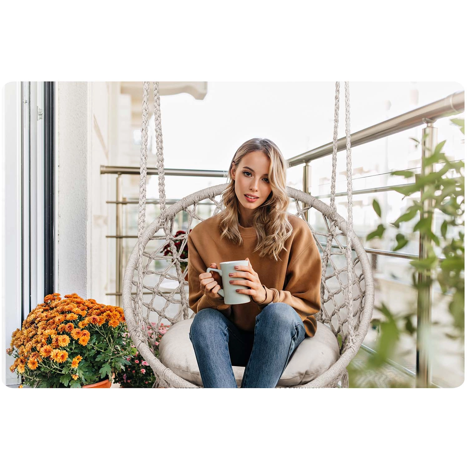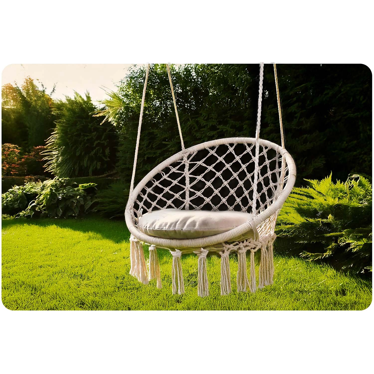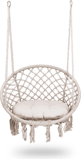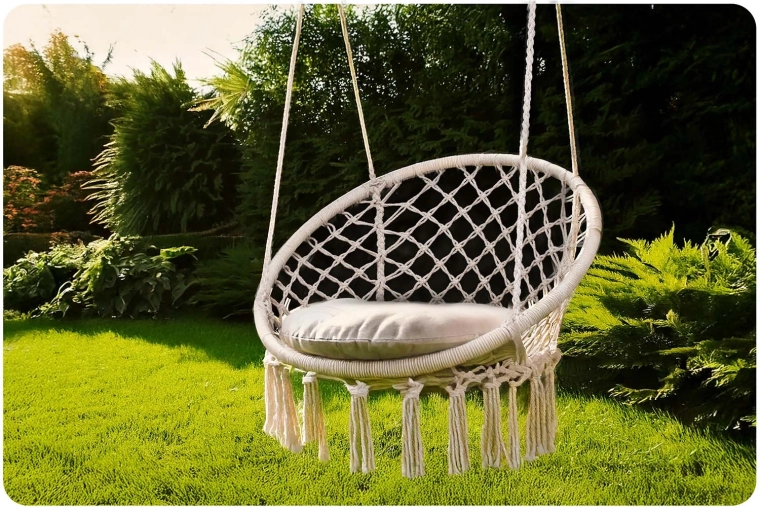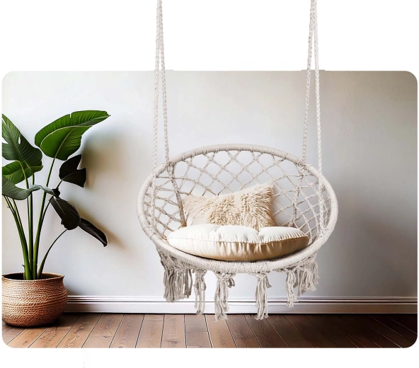 Metalringe, stærk macramé-flet og dobbeltflettede ophængsreb giver sikker gyngen og lang levetid både inde og ude.
